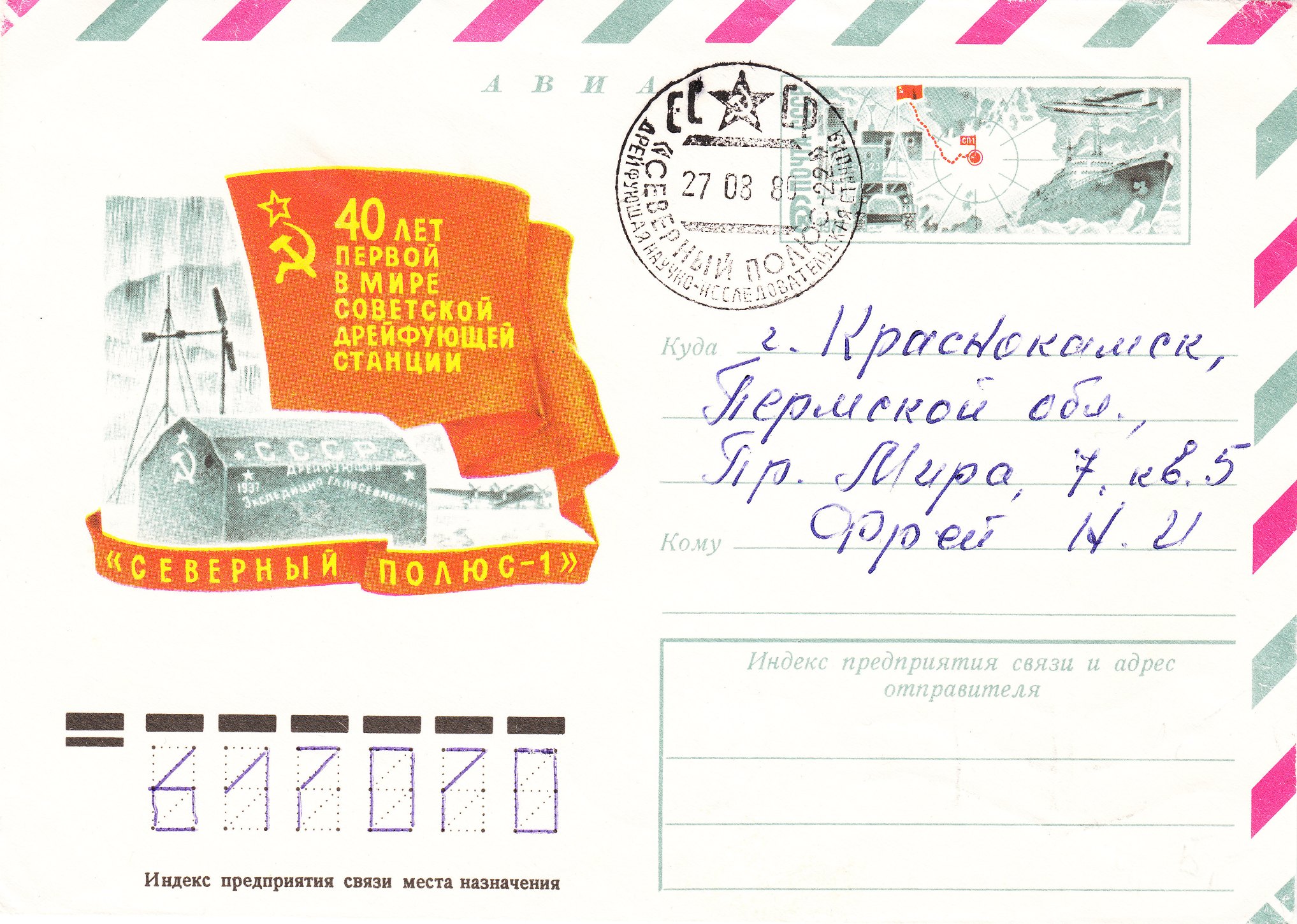 Die Entwertung erfolgte am 27.08.1980 durch einen Poststempel der Drifteisstation Nordpol-22, die einen einzigartigen Rekord hält, denn die Drifteisstation "Nordpol-22" hatte eine Lebensdauer von neun Jahren.