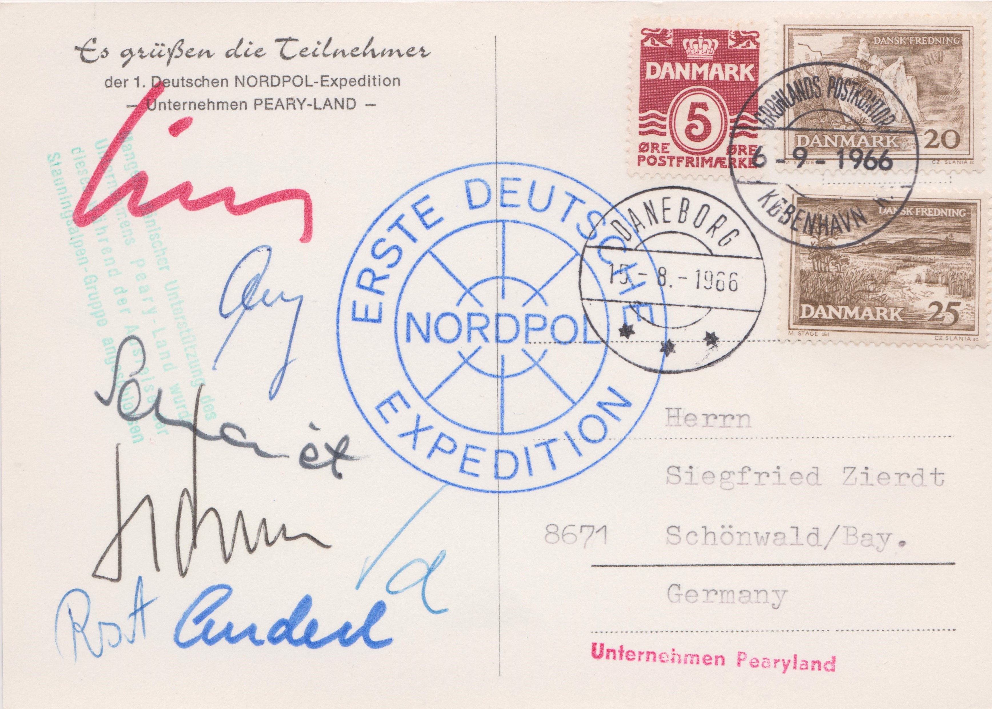Ursprünglich soll während der Expedition der Nordpol angegangen werden. 1966 und 1967 sollen die Unternehmen Peary-Land Stützpunkte für die eigentliche Nordpol-Expedition 1968 schaffen, Ausrüstung testen usw. Allerdings ist die Expedition in ihrer Anfangsphase vom Pech verfolgt: wirtschaftliche Probleme verhindern es, dass die Mannschaft Benzin für zwei Flüge von Mestersvig gen Norden einkaufen kann. Auch Herrligkoffers Gesuch beim dänischen Staatsminister bringt nichts, so dass ein Weiterflug zum "Lager Nord" am 82. Breitengrad nicht möglich ist. Insofern liefert der auf vielen Grußkarten (Edelwald Hüttel nennt in Herrligkoffers Buch "Bergsteiger erzählen" die Zahl 10.000) vorhandene Stempel "Stützpunkt Bronlundsfjord" eine Fehlinformation - diese Lage wurde nie erreicht.
