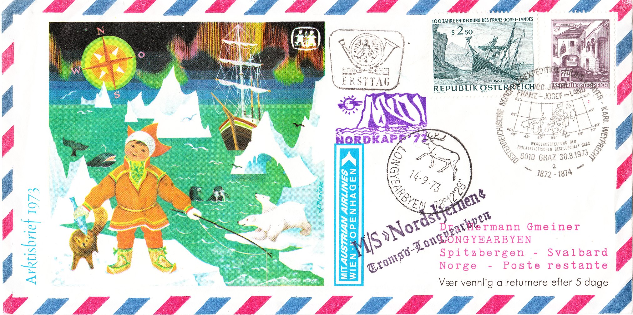 Der Brief wurde frankiert mit einer österreichischen Sondermarke, die aus Anlaß "100 Jahre Entdeckung des Franz-Josef-Landes" erschien, in Mischfrankatur mit einer Freimarke.