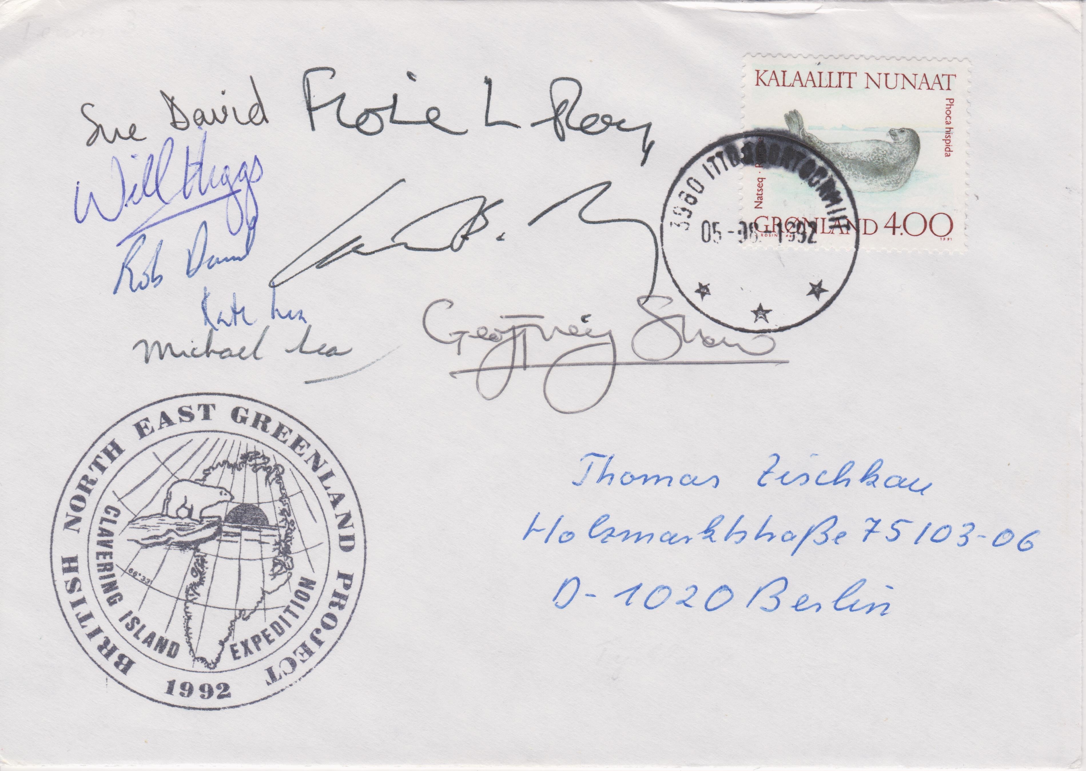 Dieser Beleg dokumentiert das "BRITISH NORTH EAST GREENLAND PROJECT CLAVERING ISLAND EXPEDITION 1992":