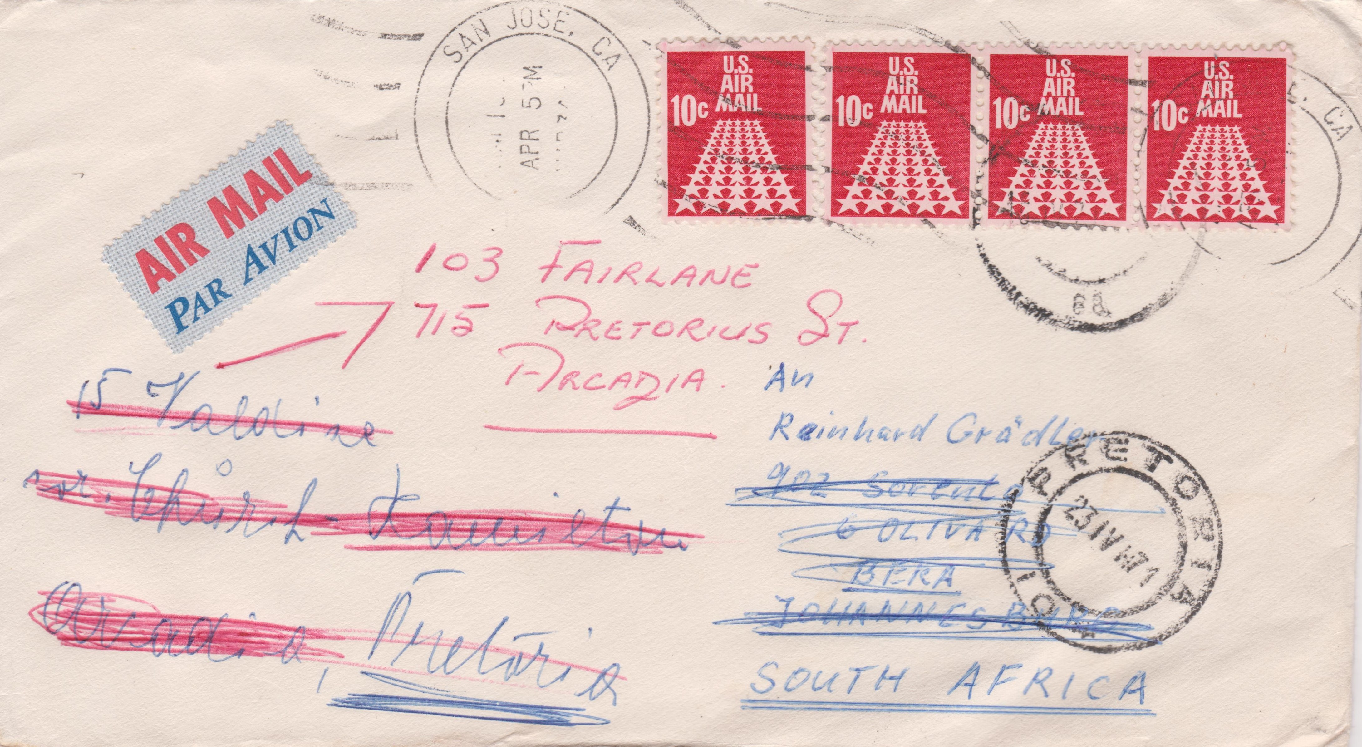 Dieser nach Johannesburg in Südafrika adressierte Luftpostbrief wurde am 05.04.1971 in SAN JOSE in Kalifornien ausgegeben:
