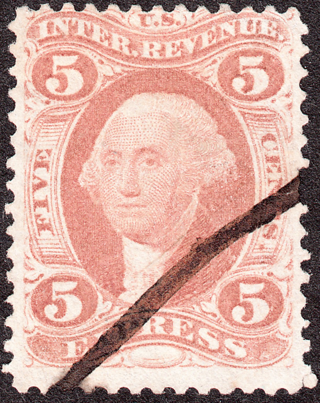 Die Wertstufe 5 Cents mit der Inschrift "EXPRESS" katalogisiert Scott als "R25", die gezähnte Version ist entsprechend die "c", hier mit Tintenstrichentwertung: