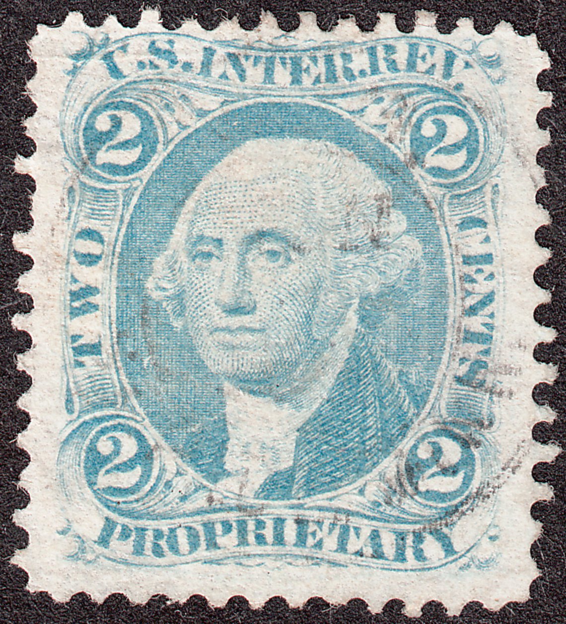 Die Wertstufe 2 Cents in blau mit der Inschrift "PROPRIETARY" ist im Scott als R13 katalogisiert, die gezähnte Version entsprechend als "c":