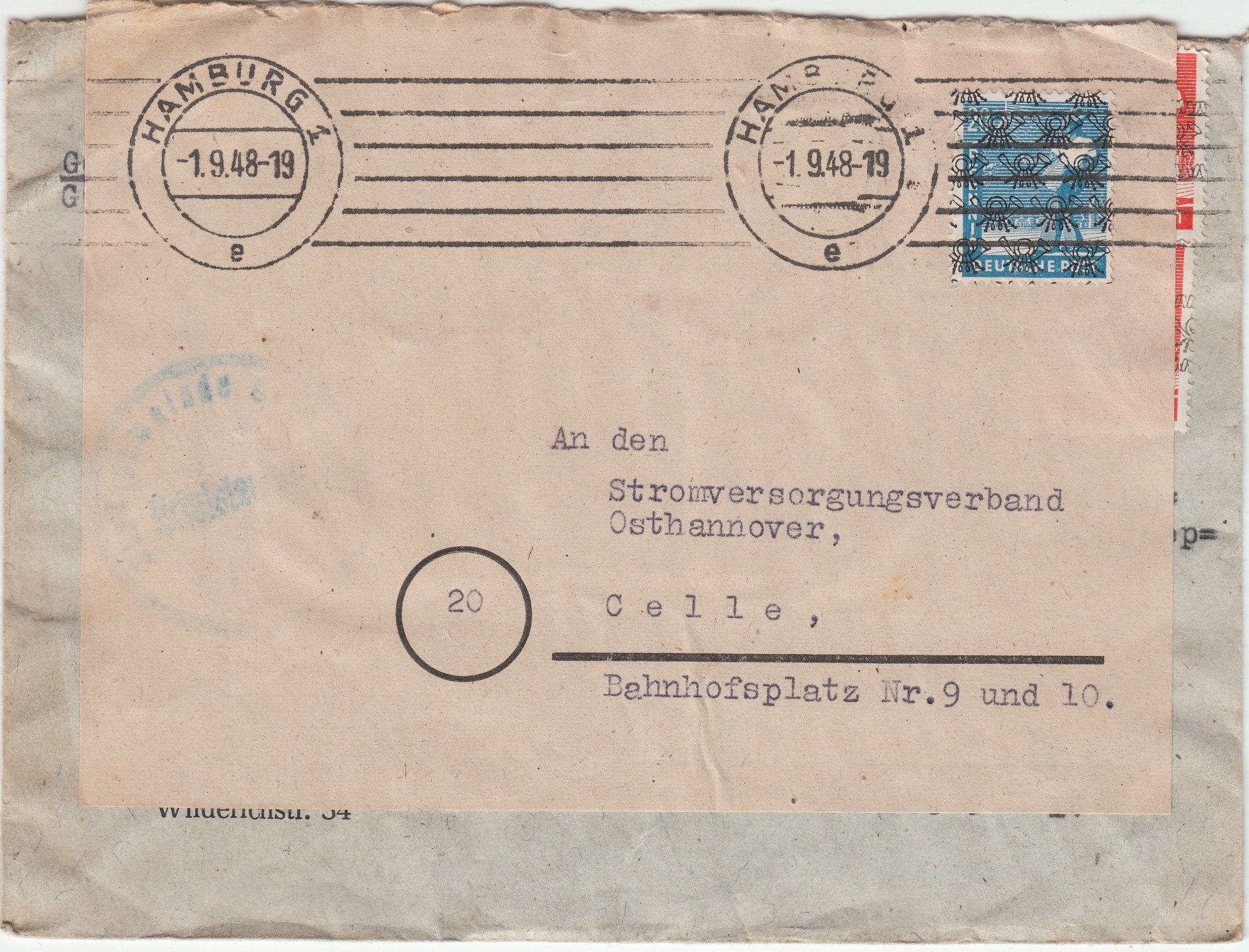 Ein Fernbrief kostete ab dem 01.09.1948 nur mehr ein Porto von 20 Pf statt zuvor 24 Pf. Hier eine portogerechte EF der MiNr. 43 II ab Hamburg auf einem doppelt verwendeten Umschlag:
