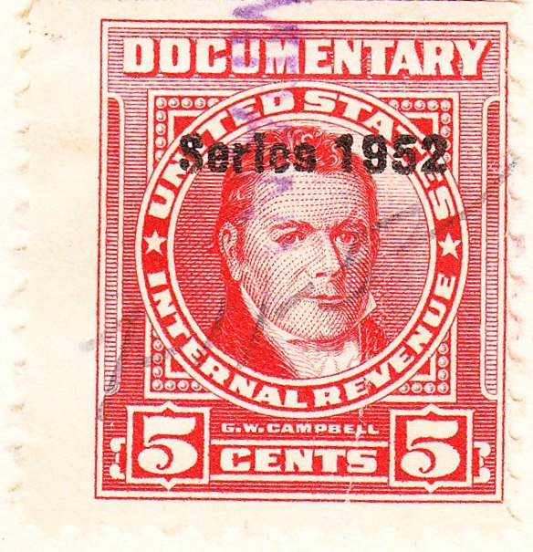 Die Wertstufe zu 5 Cents in karmin mit schwarzem Aufdruck "Series 1952" katalogisiert Scott als "R590":
