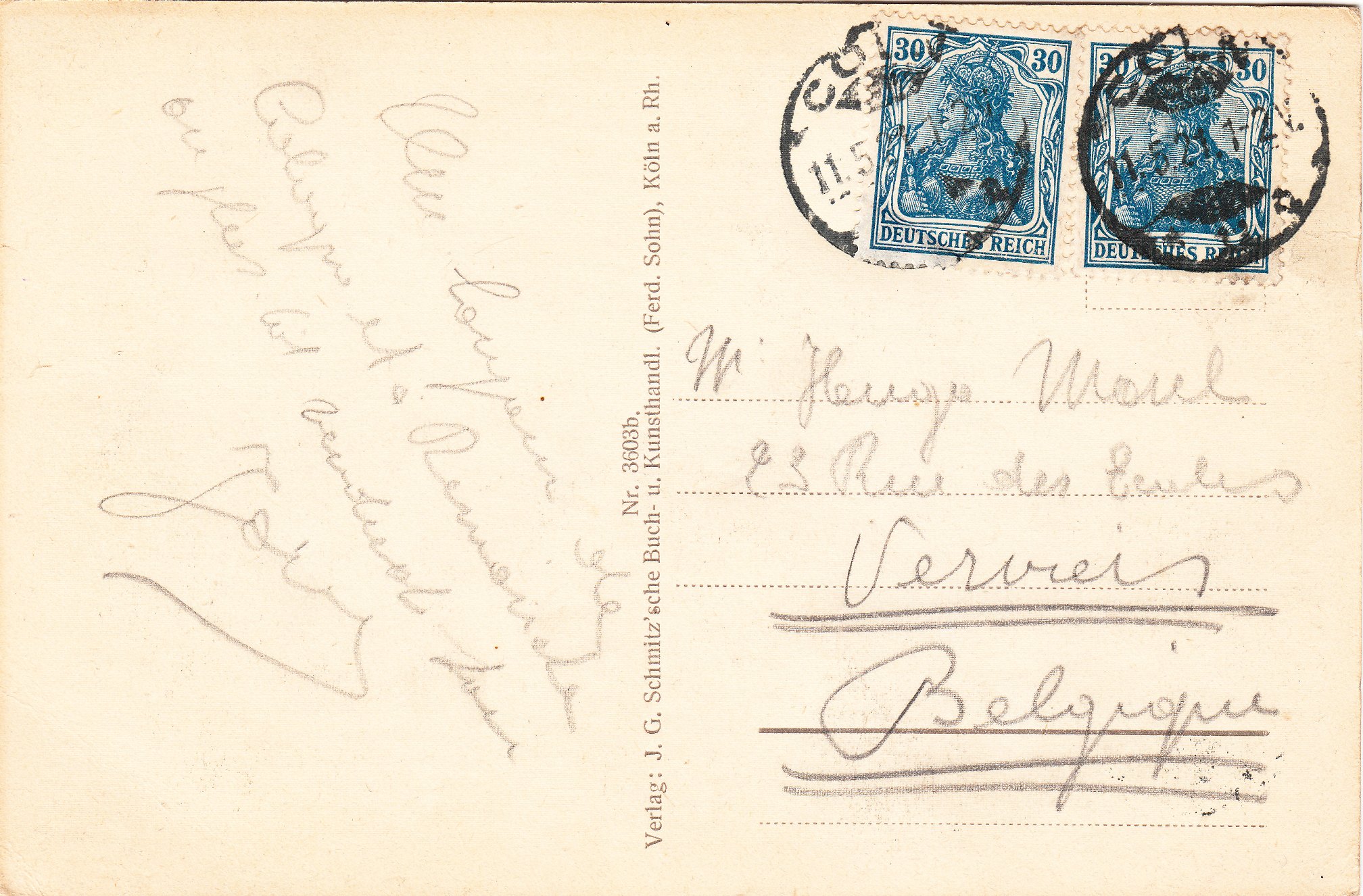 Diese Ansichtskarte nach Verviers in Belgien wurde am 11.05.1921 in Köln aufgegeben: