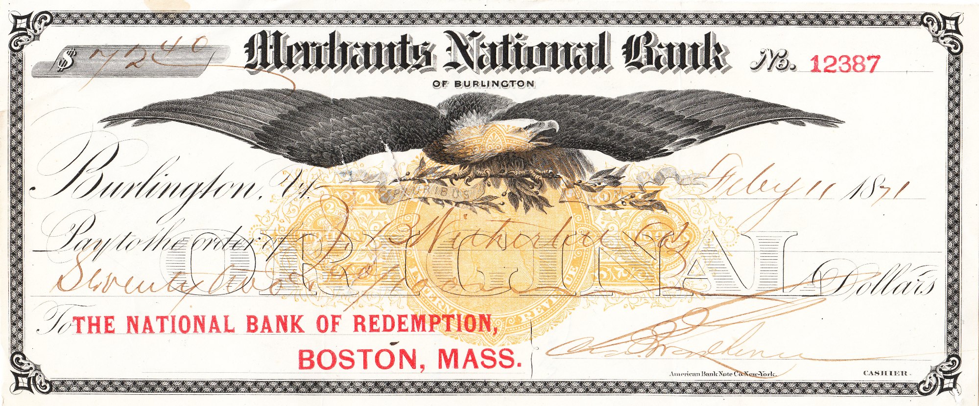 Hier der bei Scott als "RN-C1" katalogisierte Eindruck in einem Scheckvordruck der "Merchants National Bank OF BURLINGTON":