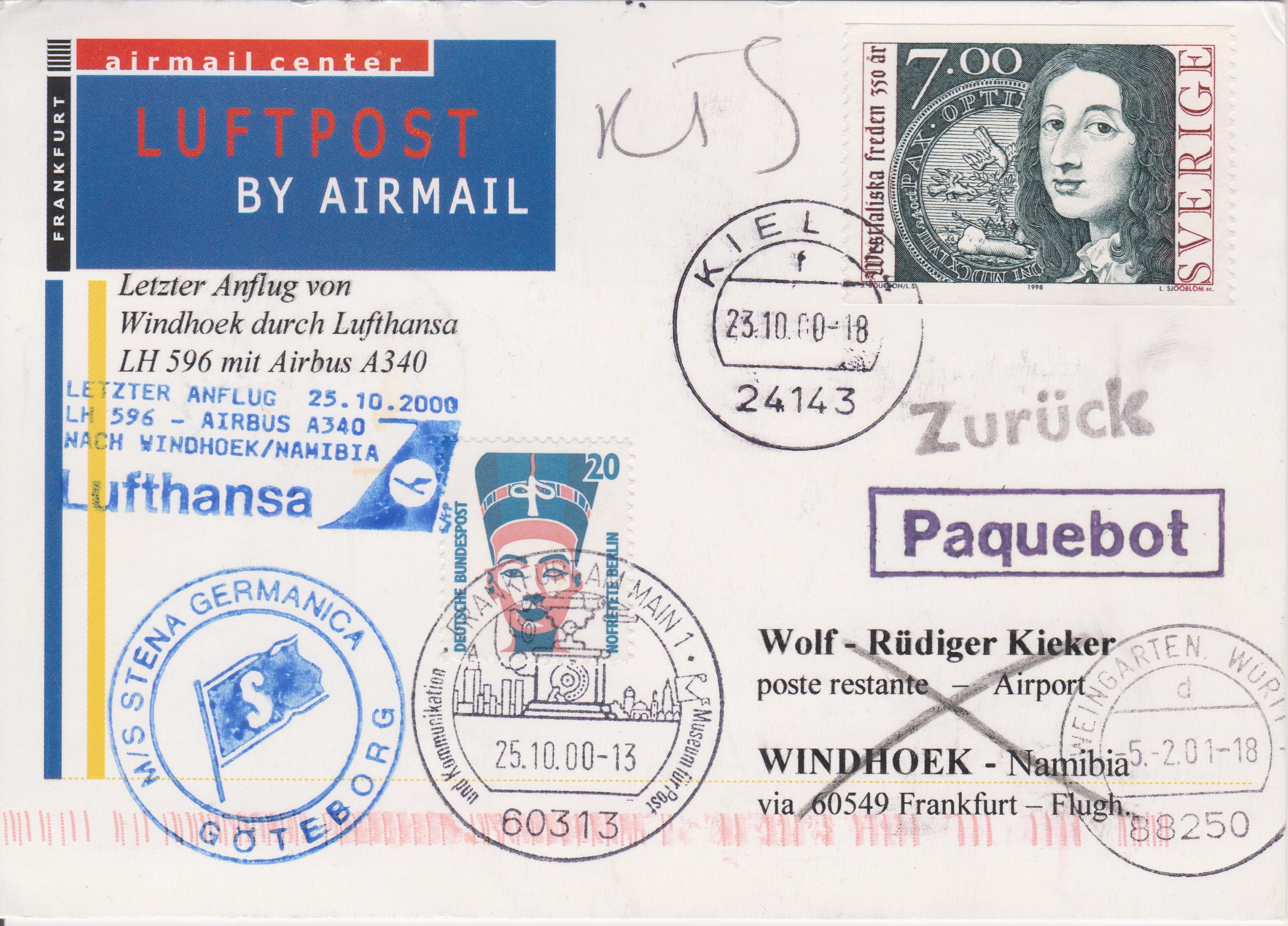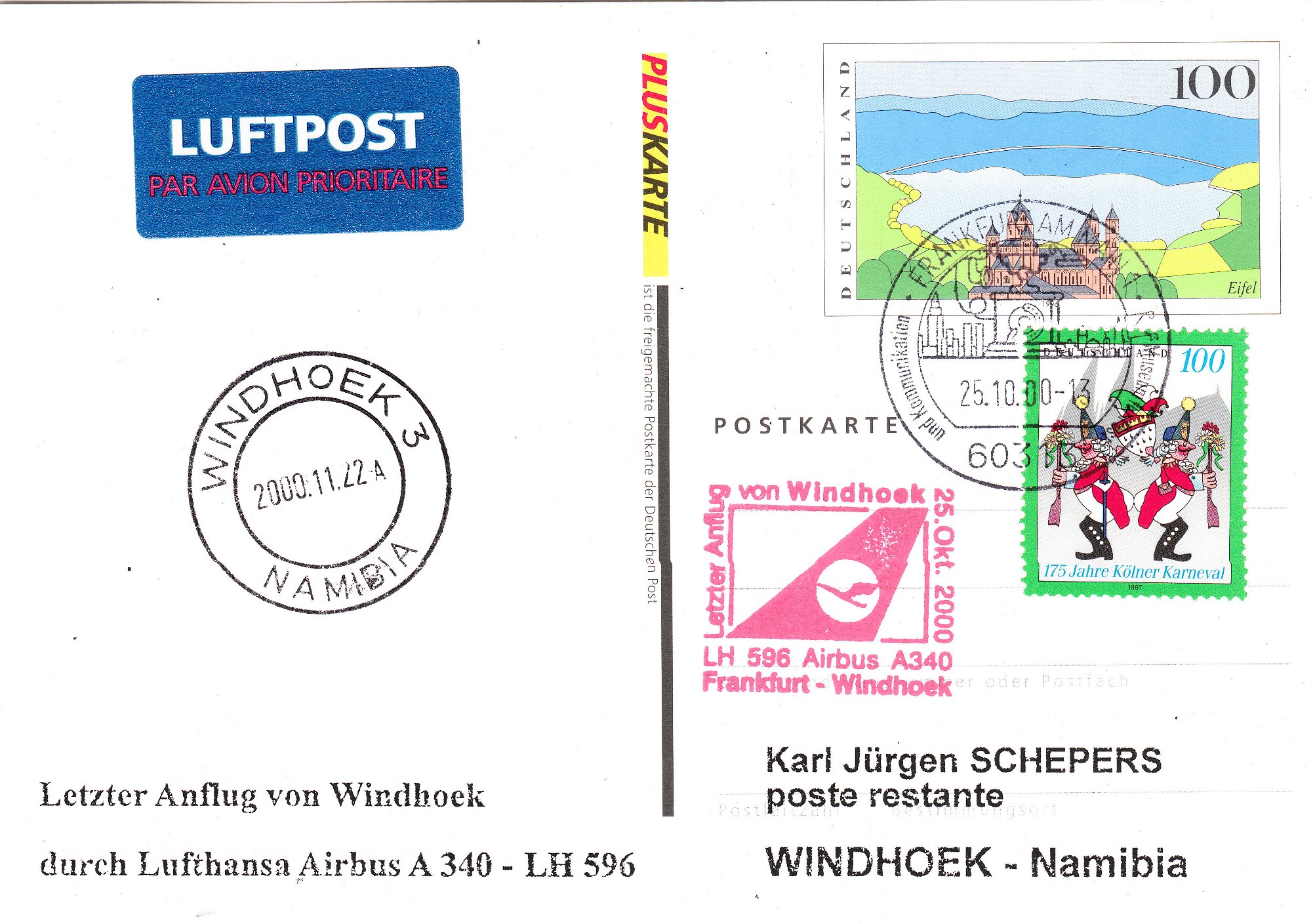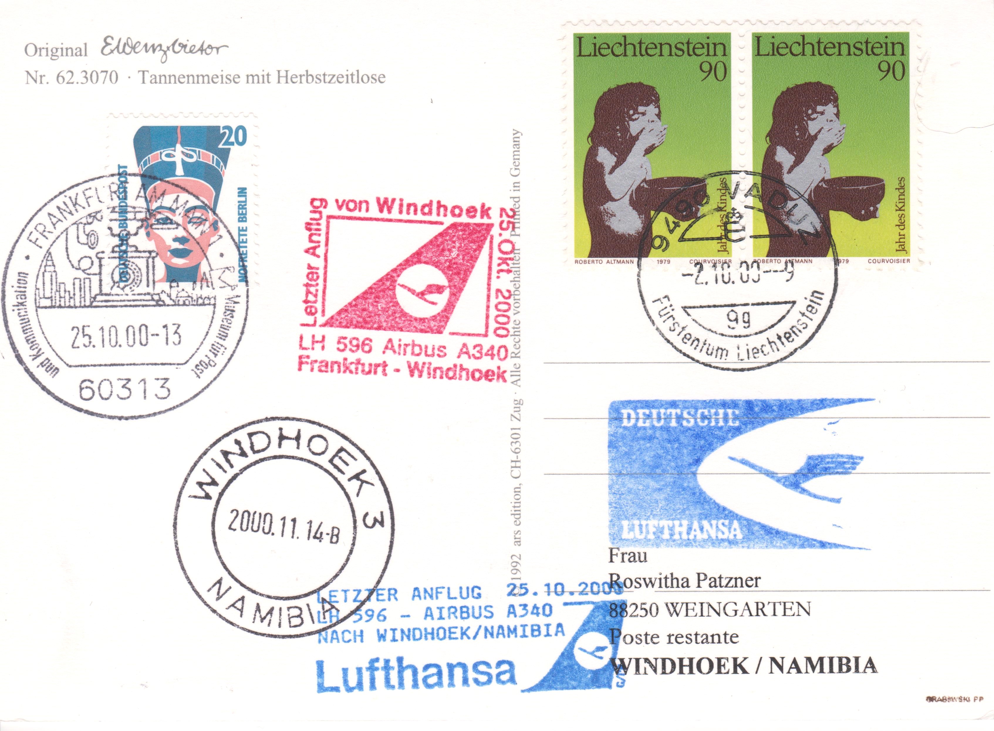 Diese Pluskarte mit Zusatzfrankatur wurde am 25.10.2000 in Frankfurt am Main aufgegeben und mit dem letzten Flug eines AIRBUS A340 auf der Linie LH 596 nach Windhoek befördert: