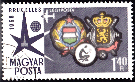 Aus dieser Serie kann ich noch eine Marke (MiNr 1523 A) mit dem Ausstellungsemblem der Weltausstellung Brüssel und den Wappen von Ungarn und Belgien zeigen.