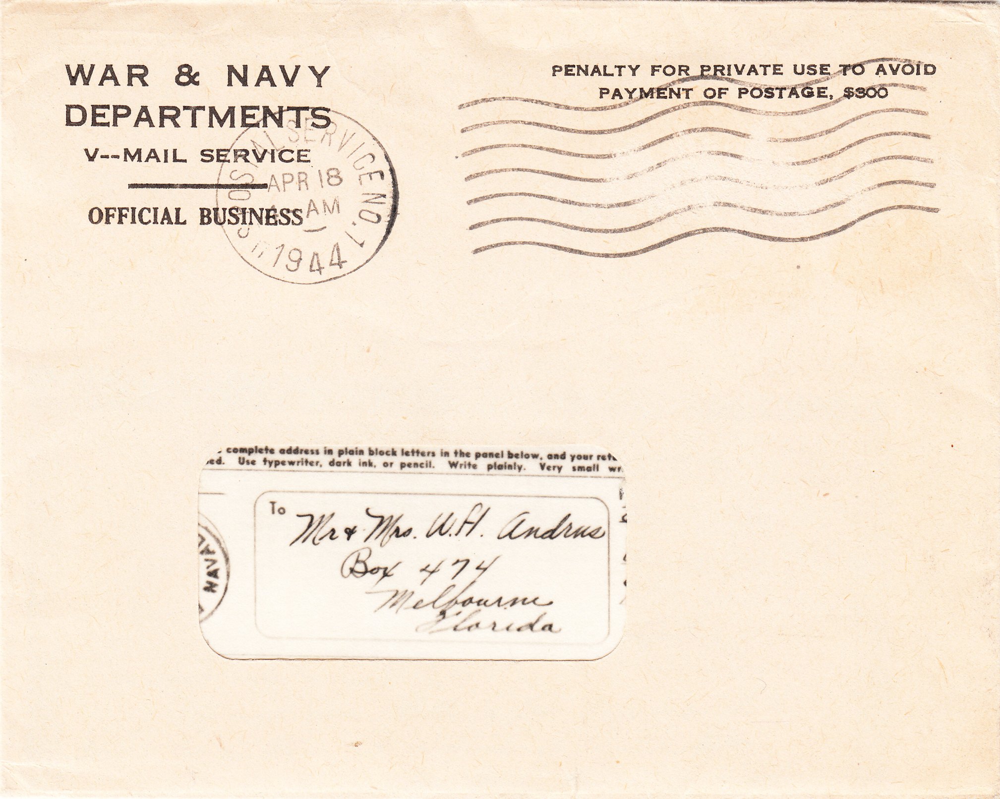 Sie wurde dem Empfänger in "Melbourne, Florida" am 18.04.1944 in diesem Umschlag zugestellt: