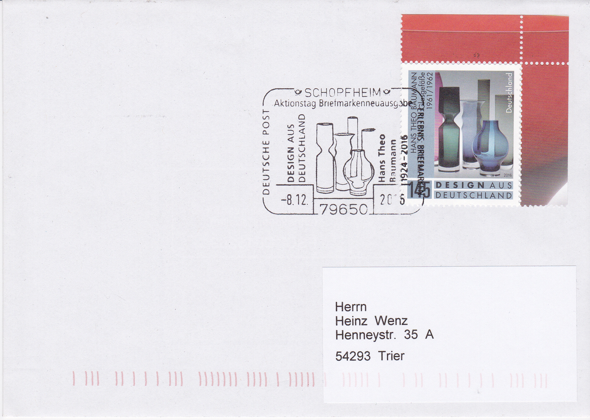Sonderstempel vom Ausgabetag der Marke aus Schopfheim, dem Sterbeort von Hans Theodor Baumann mit Abbildungen von Glasgefäßen.