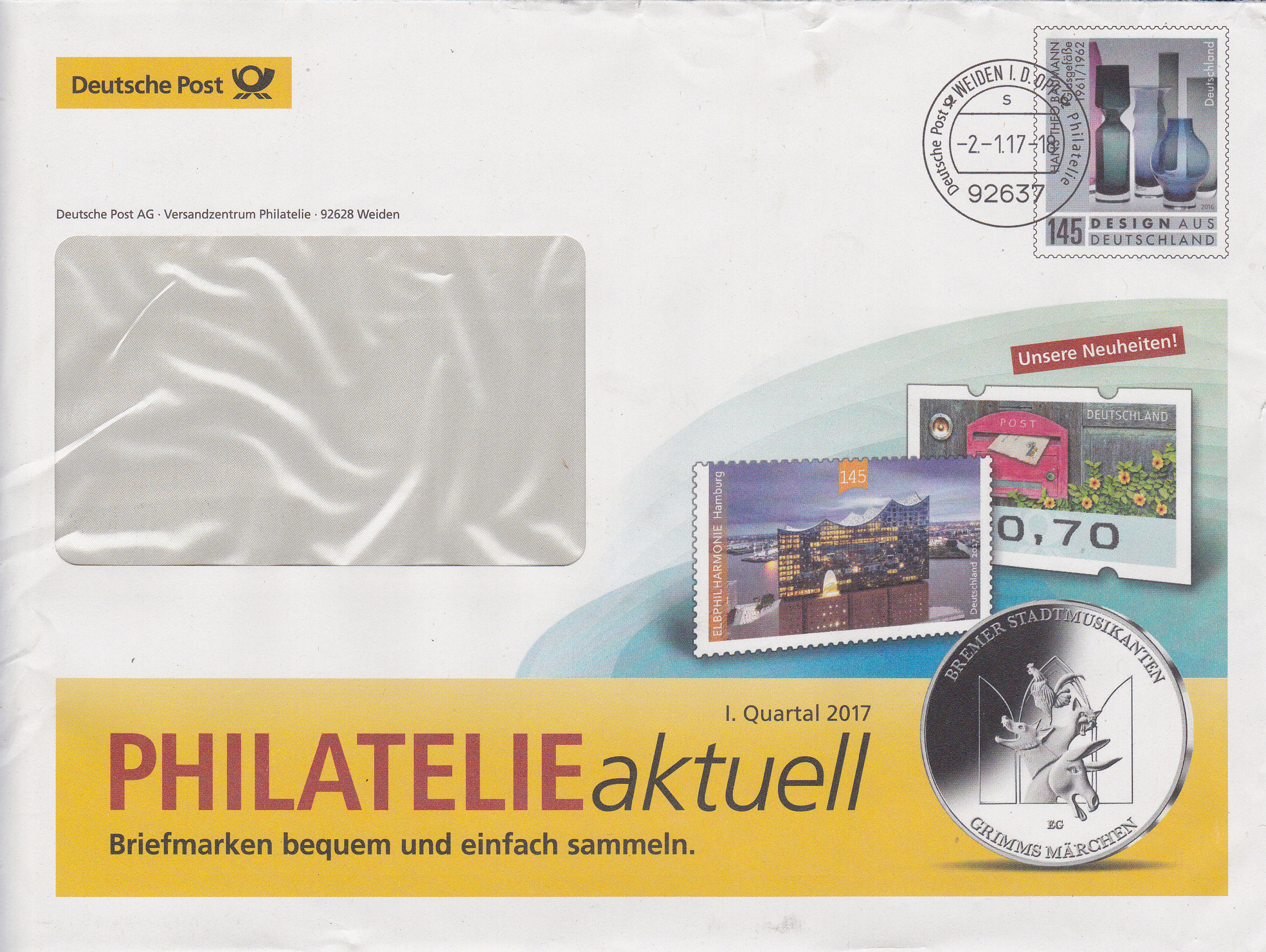 Dieser Ganzsachenumschlag im Format 229 x 162 mm hat einen Wertstempel mit der 145 Cent Marke "Glasgefäße von Theo Baumann" aus der Bauerserie "Design aus Deutschland". Die Vorausentwertung hat das Datum "-2.-1.17".