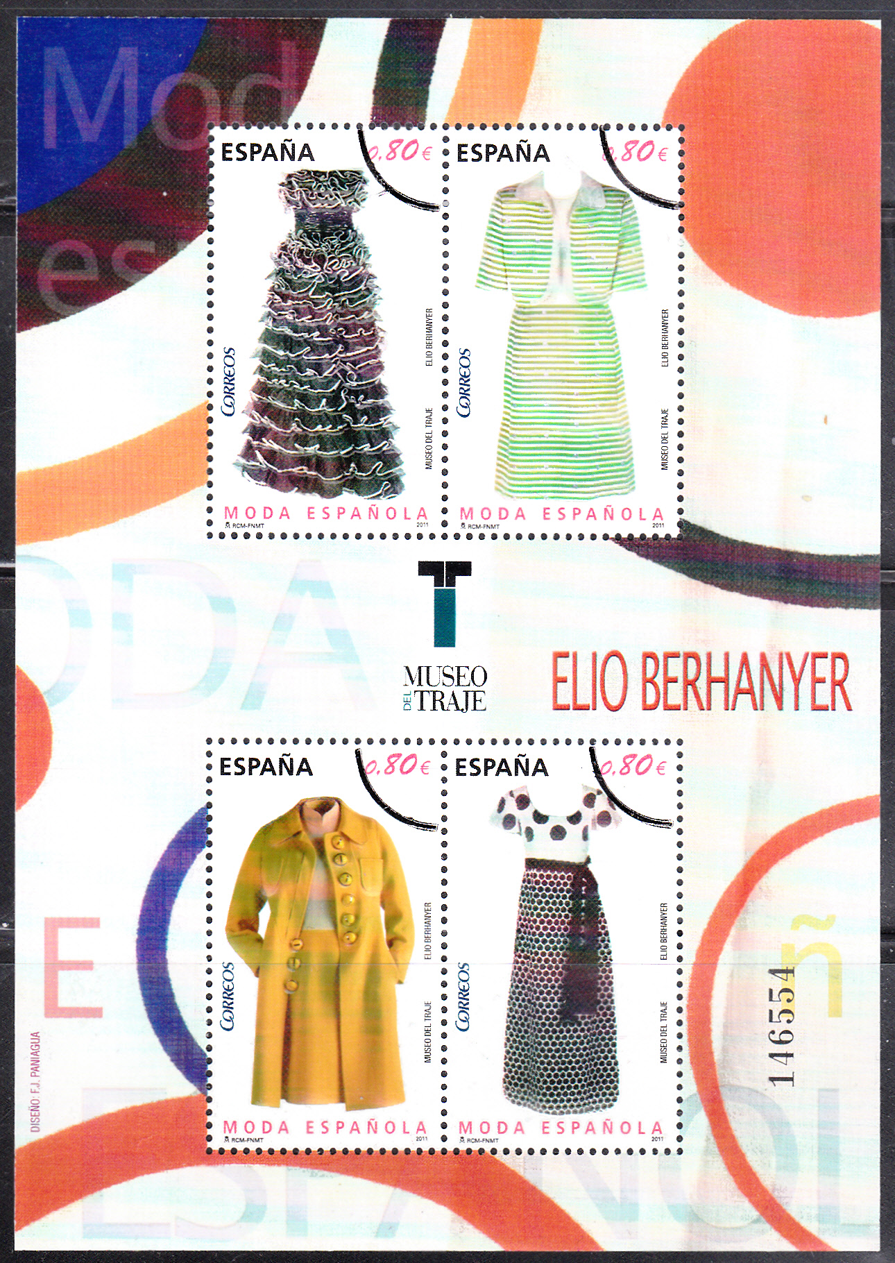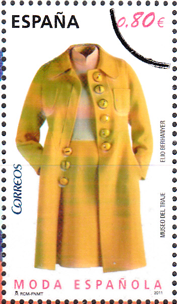 Am 20. Okt.2011 erschien in Spanien eine Blockausgabe mit Spanischer Mode von Elio Berhanyer. Auf dieser Marke (MiNr 4644) sehen wir ein langes Festkleid aus Kunstseide und Taft (1970). Das hier gezeigte Exemplar ist ein Mustermarke.