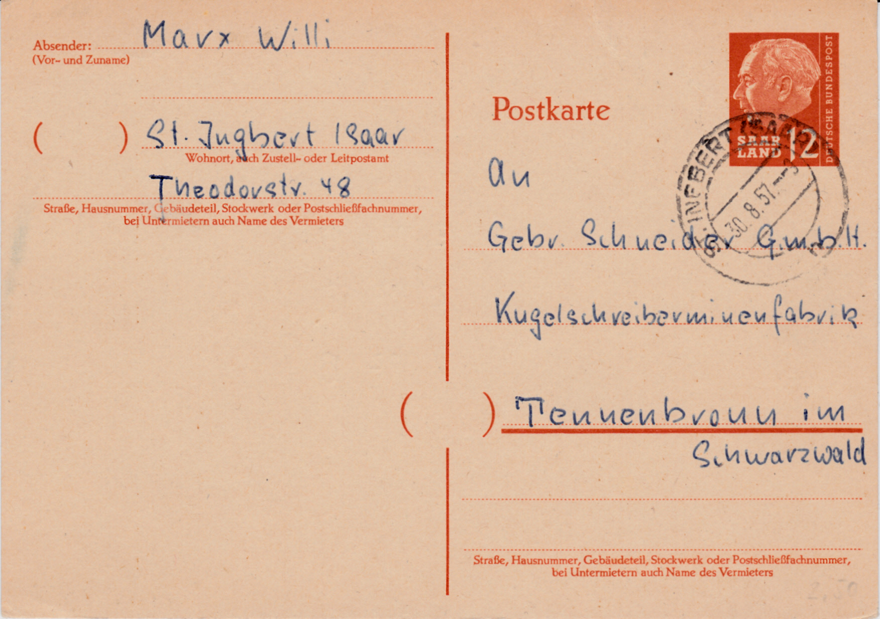 Postkarte (MiNr P 43) mit Werteindruck der Marke mit dem Kopfbild von Theodor Heuss zu 12 Franc ohne Währungsangabe.