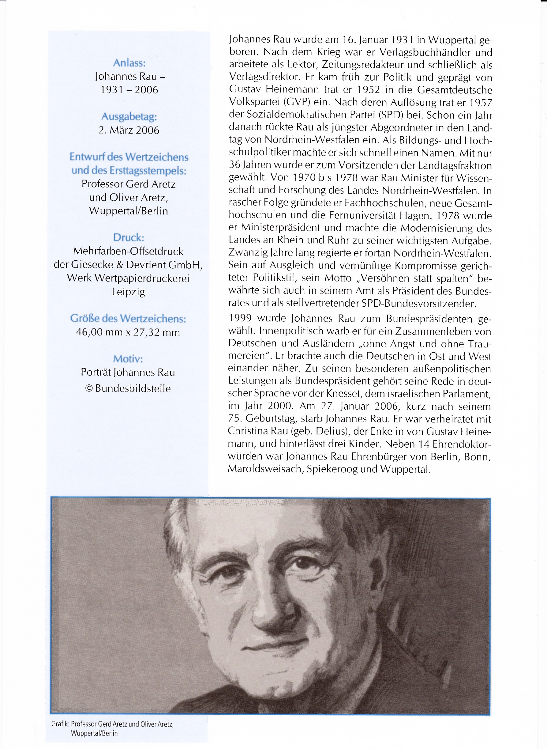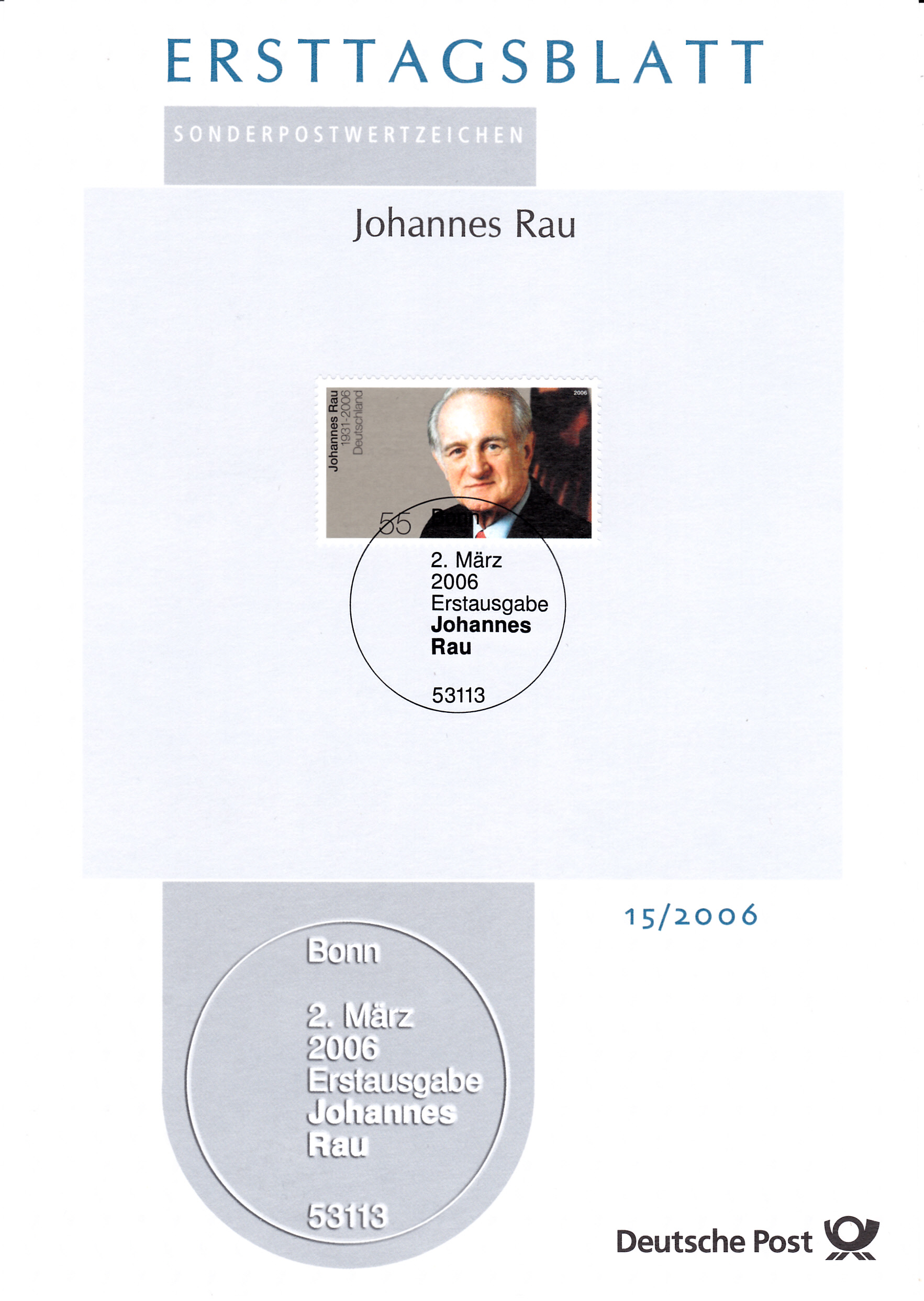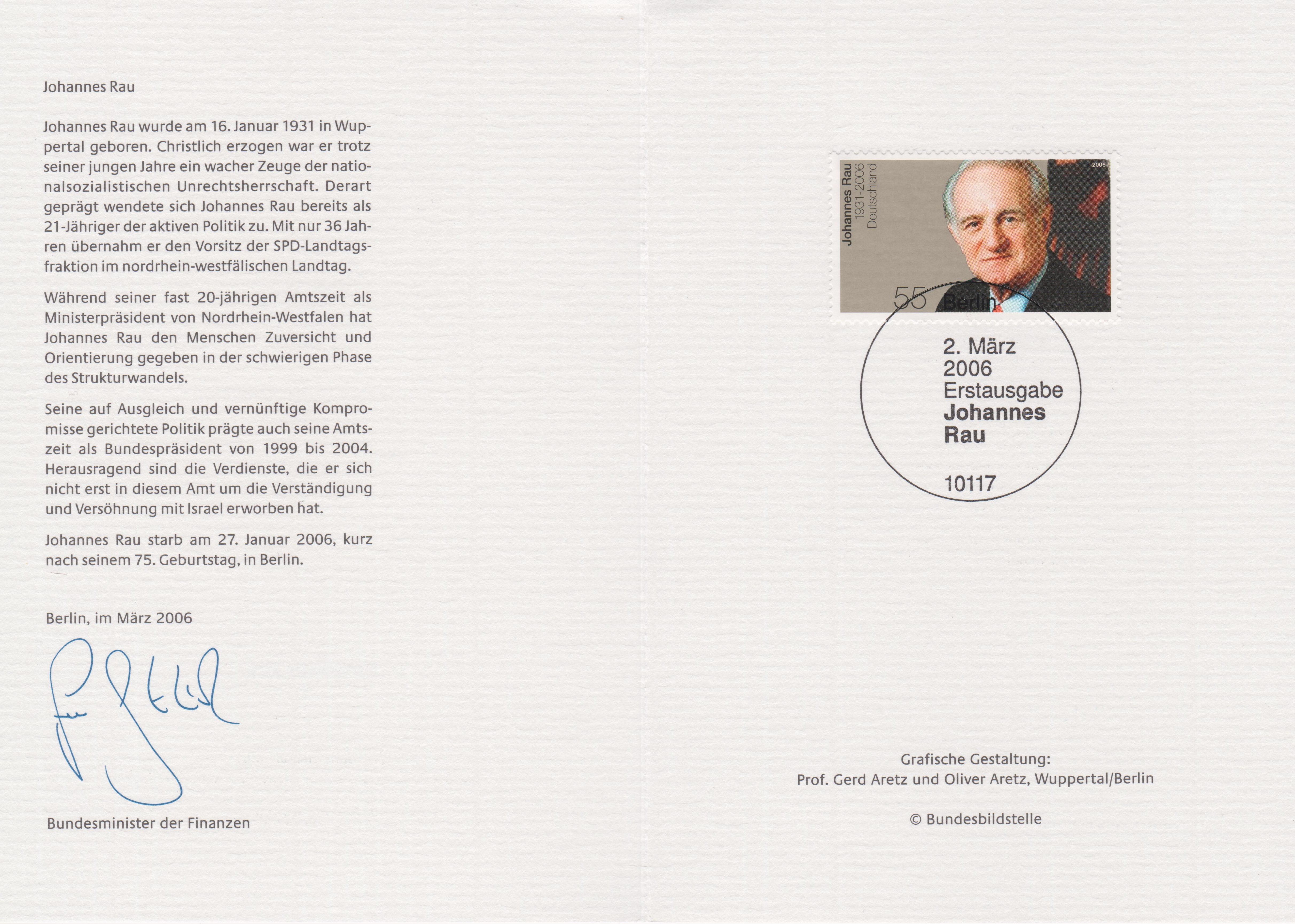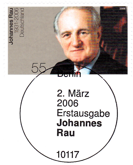 Einschreibe-Brief mit vier Marken zum Tod von Johannes (MiNr 2528) und einer Marke zu 40 Cent aus der Blumenserie (MiNr 2485). Der Viererblock mit dem Porträt von Rau wurde mit dem Ersttagsonderstempel Berlin entwertet, die Blumenmarke mit einem Tagesstempel. Das Porto berechnet so: Brief bis 20 Gramm 55 Cent, die Zusatzleistung Übergabe-Einschreiben 205 Cent, zusammen also 260 Cent.
