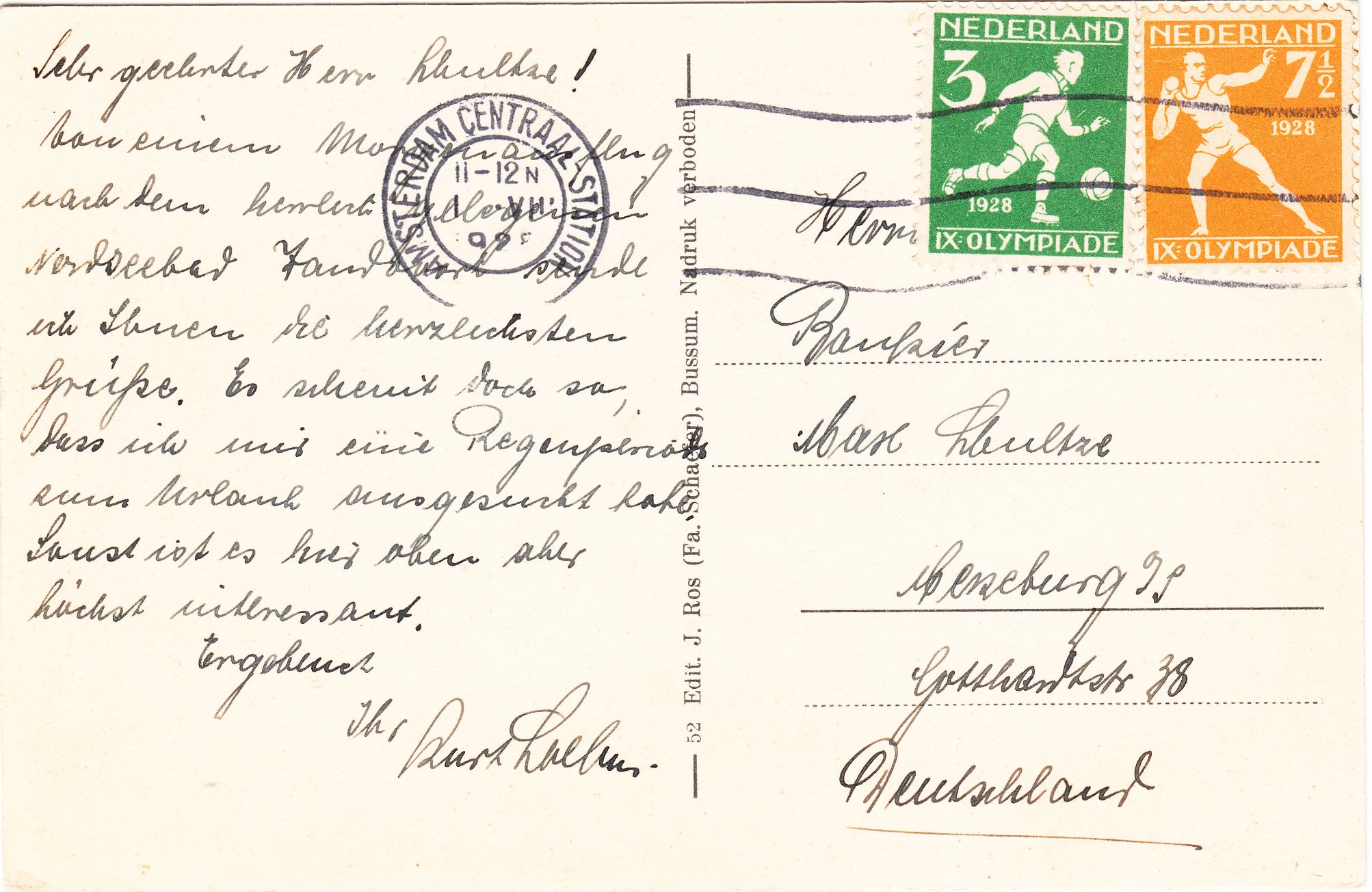 Hier die Wertstufen zu 3 Cent (+ 1 Cent), MiNr. 207 C sowie 7 1/2 Cent (+ 2 1/2 Cent), MiNr. 209 C, am 01.08.1928 auf einer Postkarte nach Deutschland:
