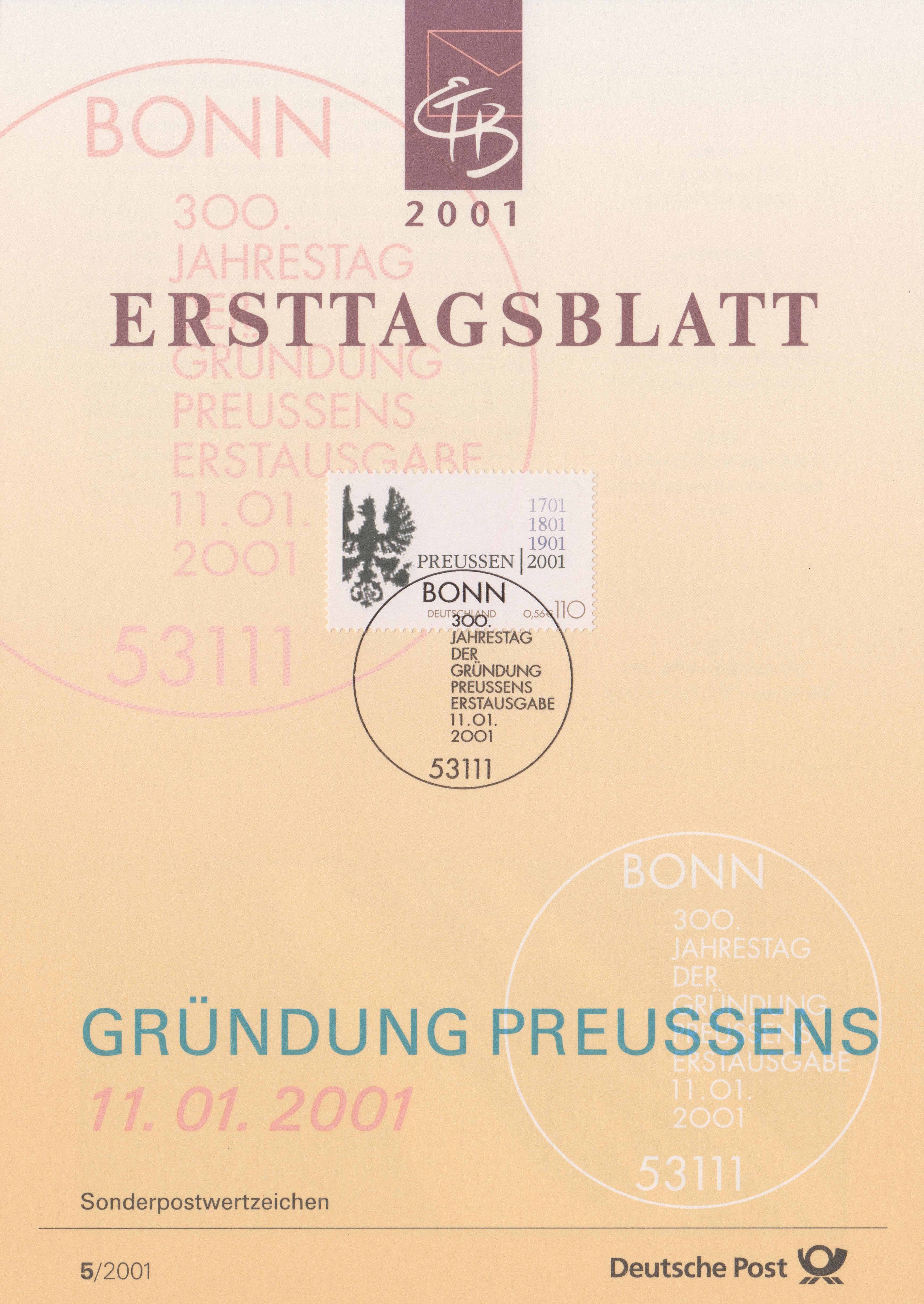 Bund MiNr. 2162 erschien am 11.01.2001 aus Anlass "300. Jahresttag der Gründung Preussens" und zeigt den preussischen Wappenadler, hier auf dem in einer Auflage von 200 000 Stück erschienenen ETB 5/2001: