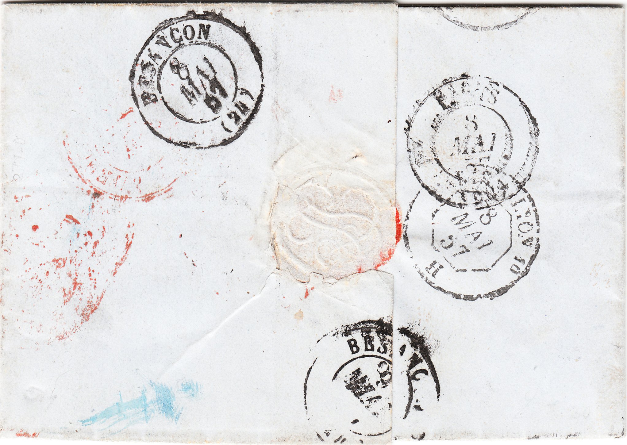 Der Brief lief am 08.05.1857 über Valenciennes und Paris sowie die Bahnstrecke Paris-Lyon nach Besançon, was rückseitig Durchgangsstempel dokumentieren.