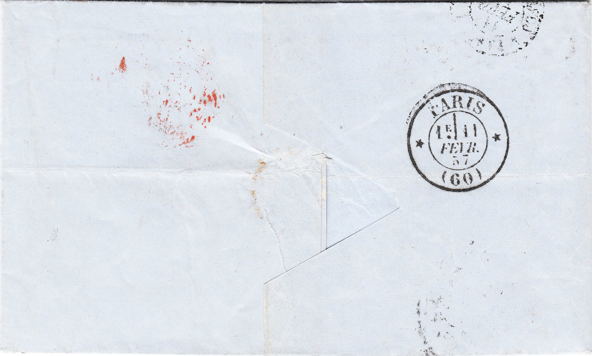 Rückseitig finden sich zwei Zweikreisstempel aus Paris, einmal vom 26.01.1857 ein Stempel mit der Inschrift "POSTE RESTANTE" als Ankunftsstempel sowie einmal vom 28.01.1857 ein Stempel mit der Kennziffer "1".