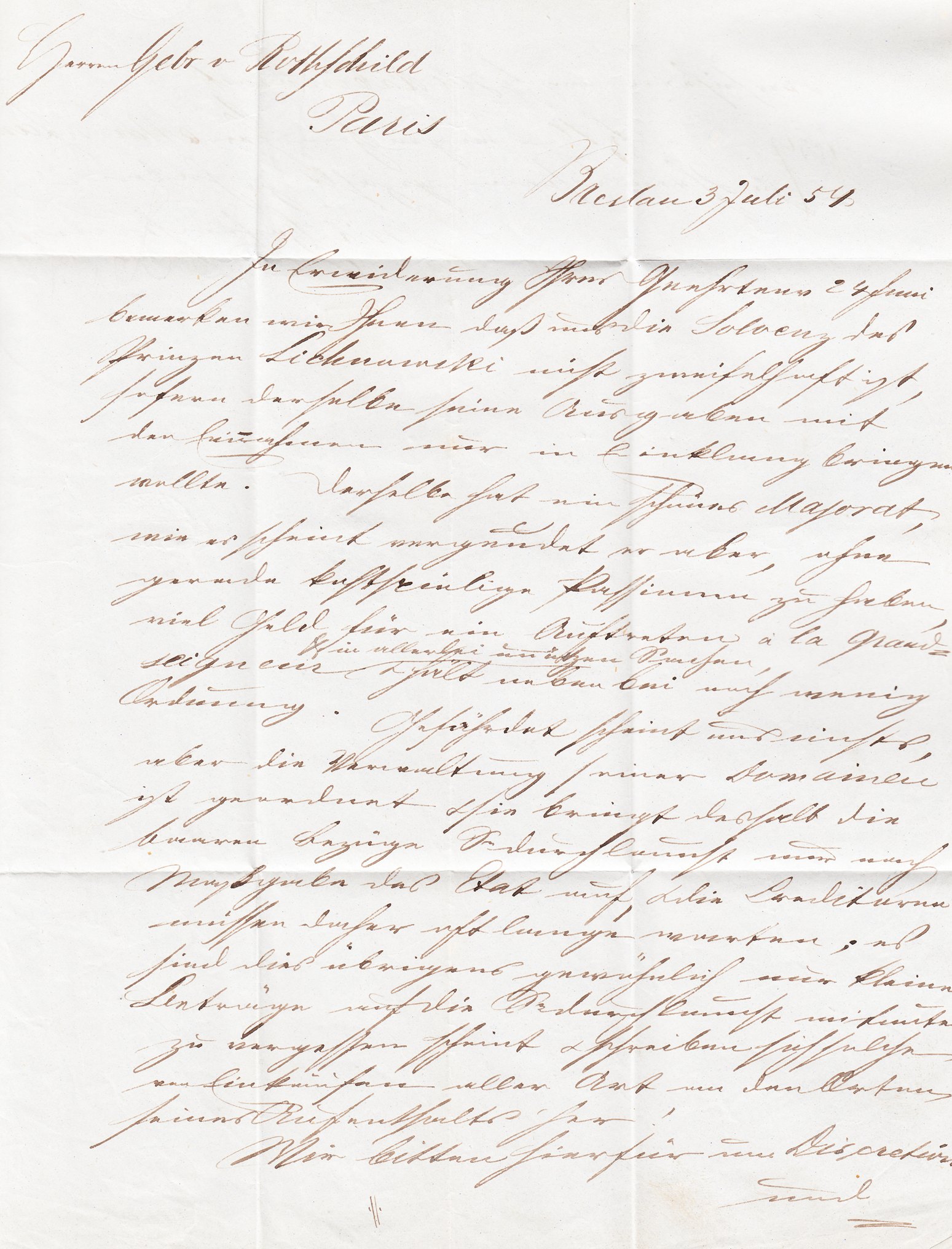 Hier ein Brief adressiert an die Gebrüder Rothschild in Paris, aufgegeben am 03.07.1854 in Breslau: