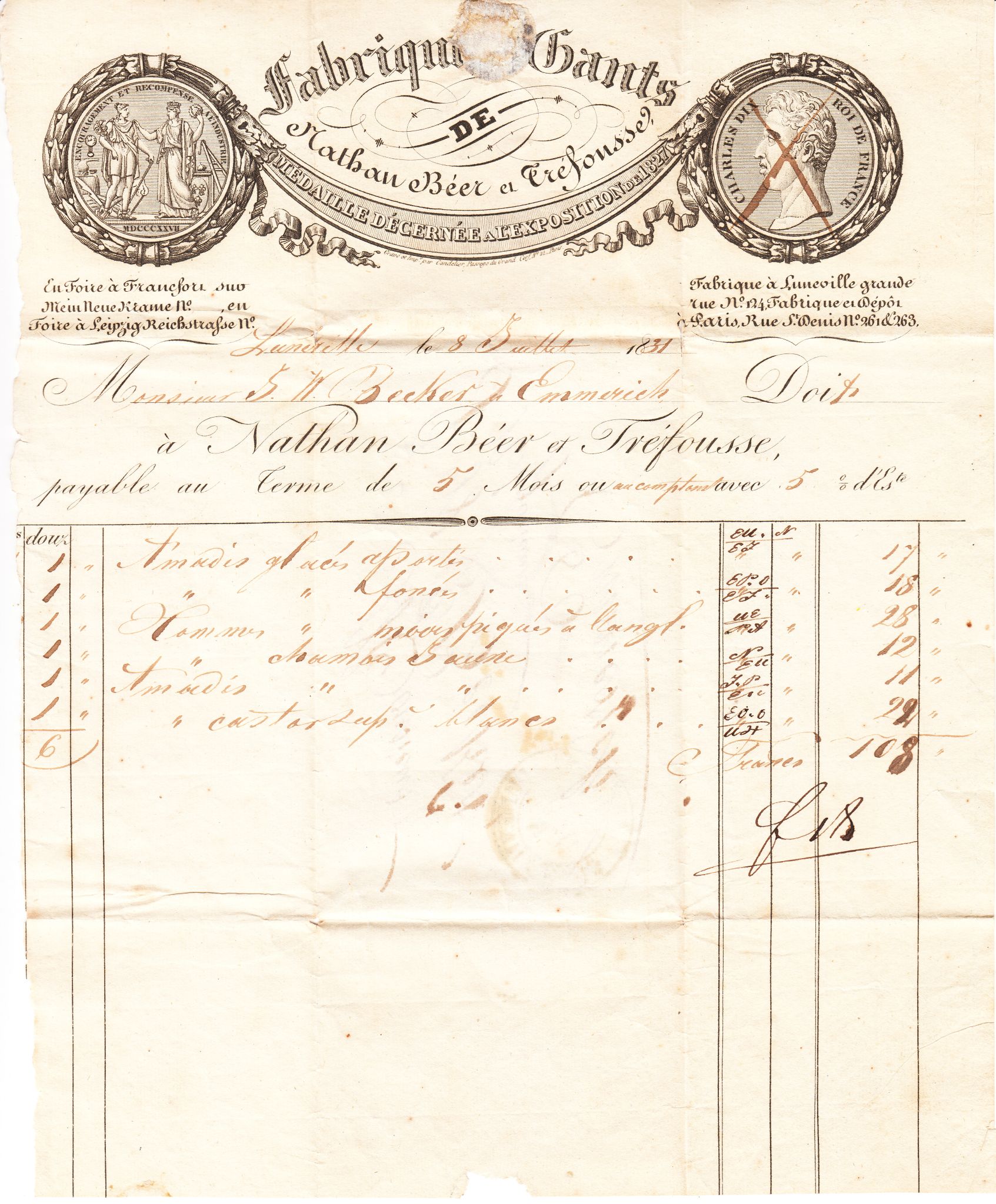 Hier als erstes Beispiel ein Vordruck einer Rechnung vom 08.07.1831 aus Luneville, der am 09.07.1831 zu einem Brief gefaltet und nach Emmerich adressiert zur Post gegeben wurde: