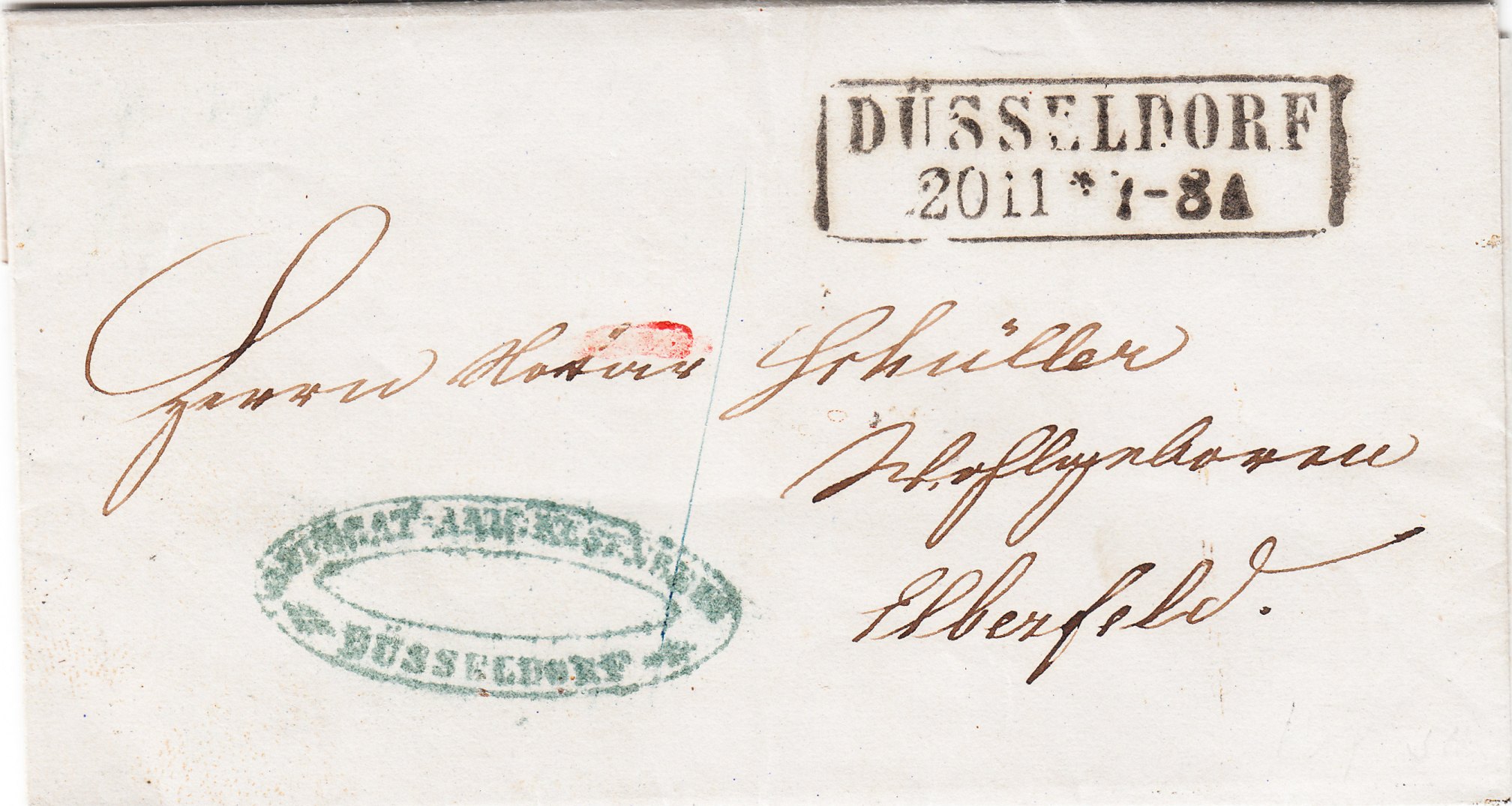 Portobrief von Düsseldorf nach Elberfeld mit zweizeiligem Rahmenstempel "DÜSSELDORF 2011 * 7-8 A":