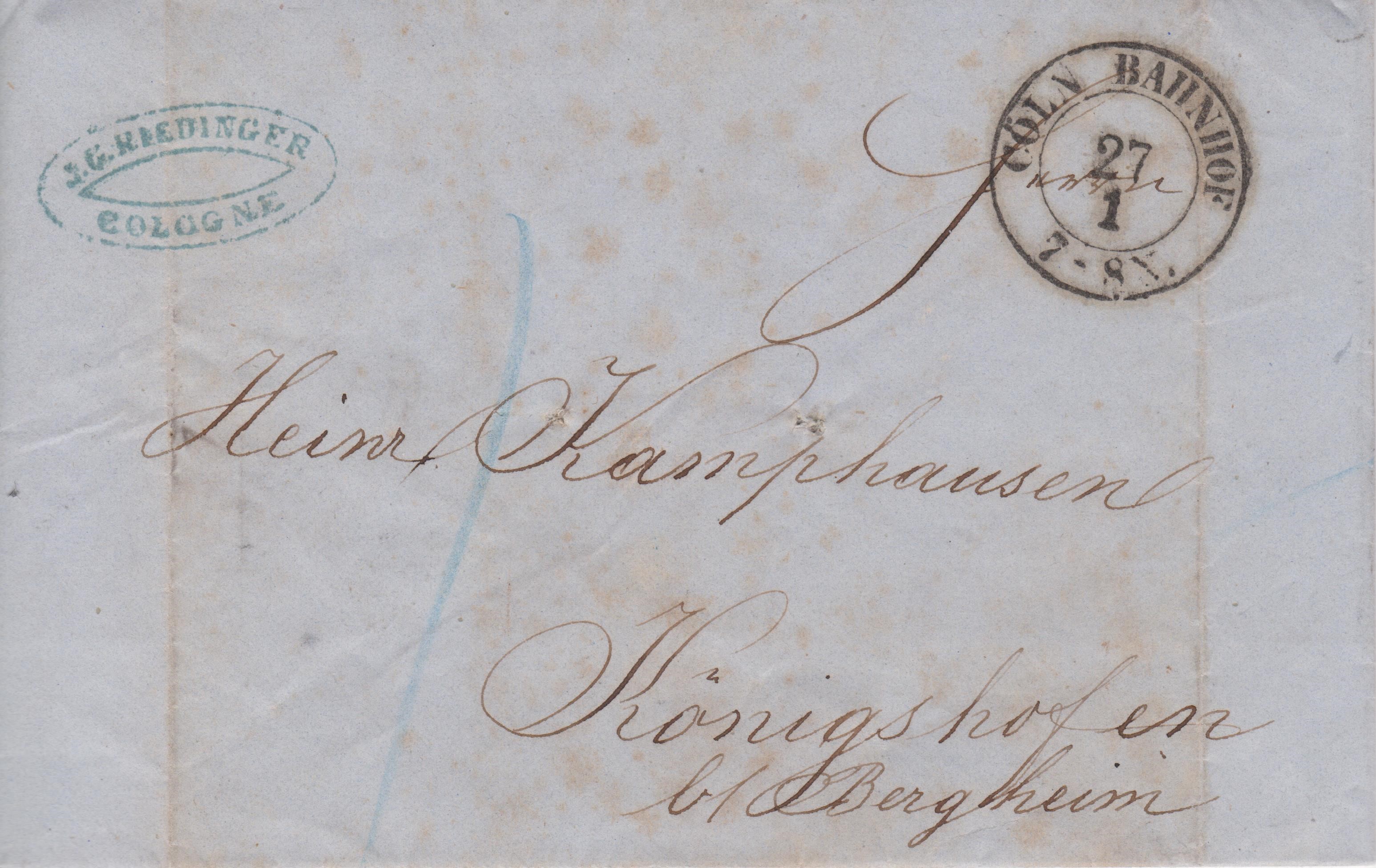 Dieser nach Königshofen bei Bergheim adressierte Brief wurde am 27.01.1862 aufgegeben in CÖLN BAHNHOF: