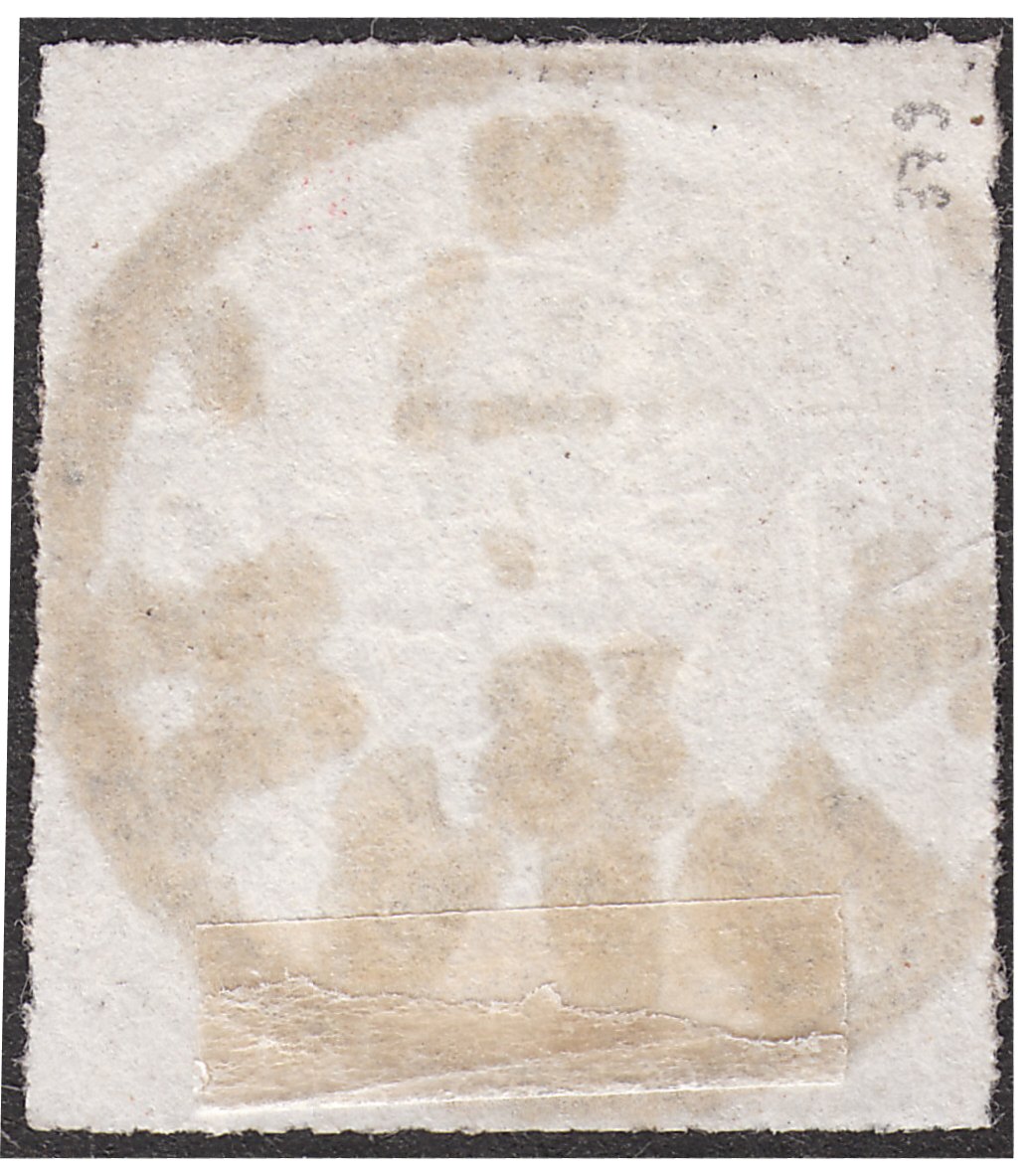 Rückseitig trägt dieses Exemplar in der Ecke unten rechts einen Stempel von einem früheren Besitzer. Dabei handelt es sich nicht etwa um einen Prüferstempel: