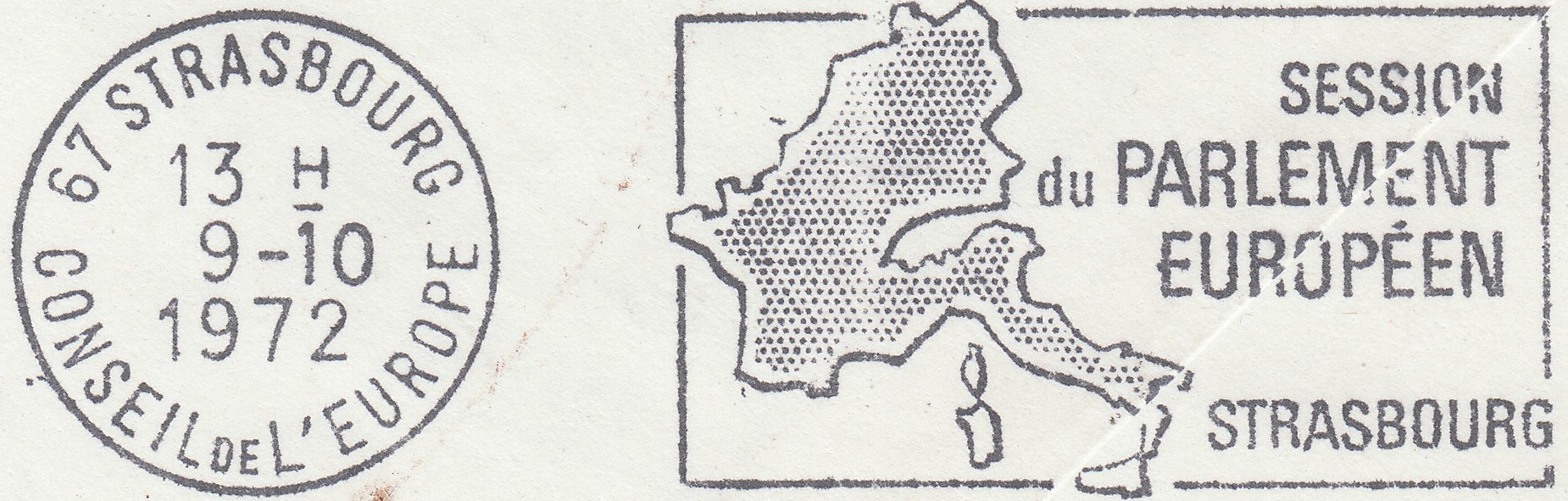 Da sich der Beleg als nicht zustellbar herausstellte wurde am 09.10.1972 auf der Rückseite ein Maschinenstempel aus Strasbourg angebracht, der im Rundstempel unten "CONSEIL DE L'EUROPE" also Europarat, beinhaltet. Der Werbeeinsatz rechts von diesem Tagesstempel wirbt für das Europäische Parlament in Strasbourg.