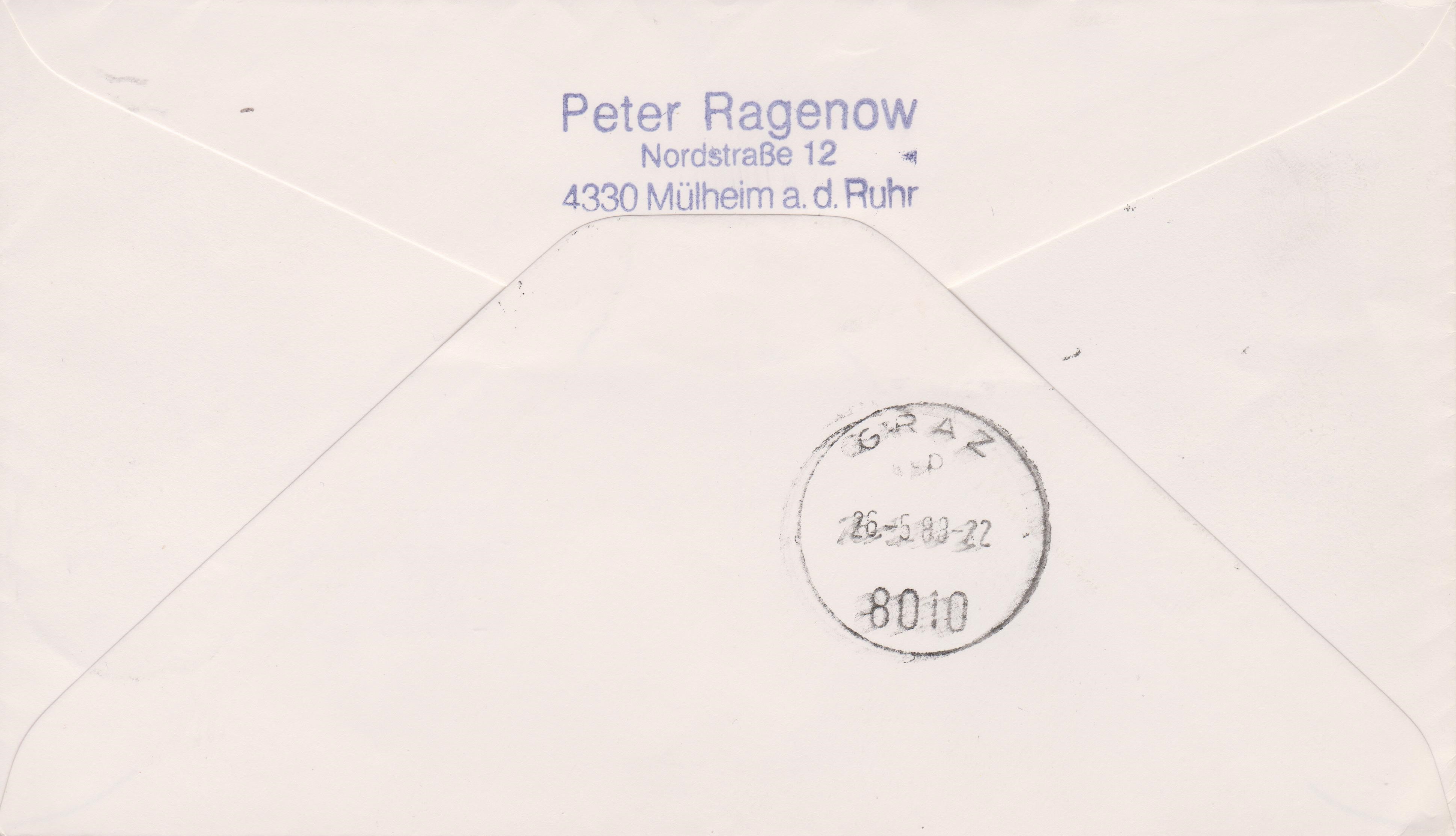 Für einen Brief nach Österreich galt zwar das Inlandsporto, dieses betrug jedoch für einen Brief bereits seit dem 01.07.1982 80 Pf, und nicht mehr, wie hier frankiert, 60 Pf! Laut rückseitig abgeschlagenem Tagesstempel kam der Brief am 26.05.1988 an seinem Bestimmungsort GRAZ an.
