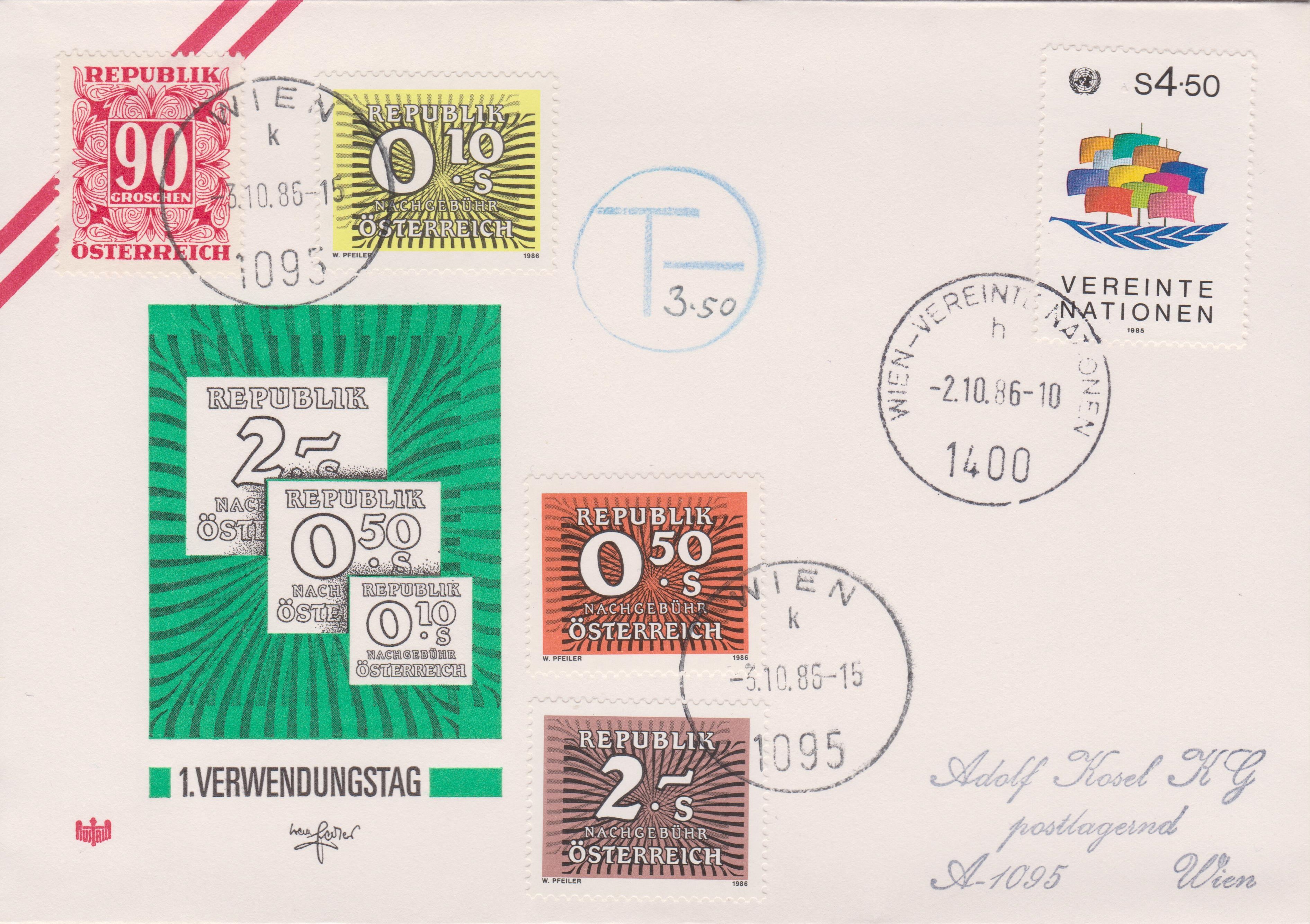 Am 03.10.1986 erschienen die drei Wertstufen zu 0,10 S, MiNr. P 264, 0,50 S, MiNr. P 265, sowie 2 S, MiNr. P 266 hier auf einem Ersttagsbrief innerhalb von WIEN mit Aufgabestempel "WIEN - VEREINTE NATIONEN" sowie Taxstempel mit handschriftlichem Vermerk "3,50", die dann in Form von Portomarken verklebt wurden: