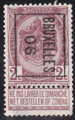 Hier nun ein komplettes Exemplar der MiNr 78 V mit dem Anhängsel. Sendungen, die mit Marken mit Anhängsel frankiert waren, wurden am Sonntag nicht zugestellt. Die meisten Versender haben die Anhängsel aber abgetrennt, so dass die Sendung dann auch am Sonntag zugestellt wurde. Die Marke hat eine Vorausentwertung "Brussel 11 Bruxelles" im Buchdruck in der Aufdrucktype b 1: