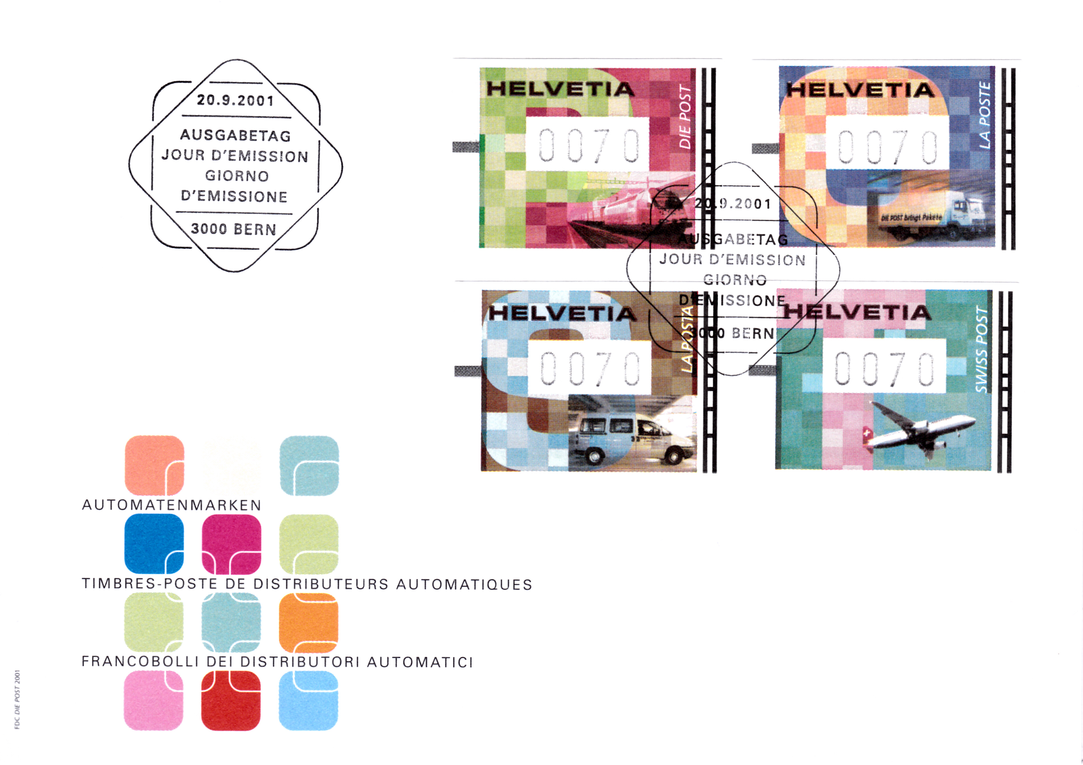 FDC der Schweizer Post mit der bereits gezeigten Automatenmarken aus der Serie "Transportmittel der Post" mit dem Motiv "Flugzeug" (MiNr 14).