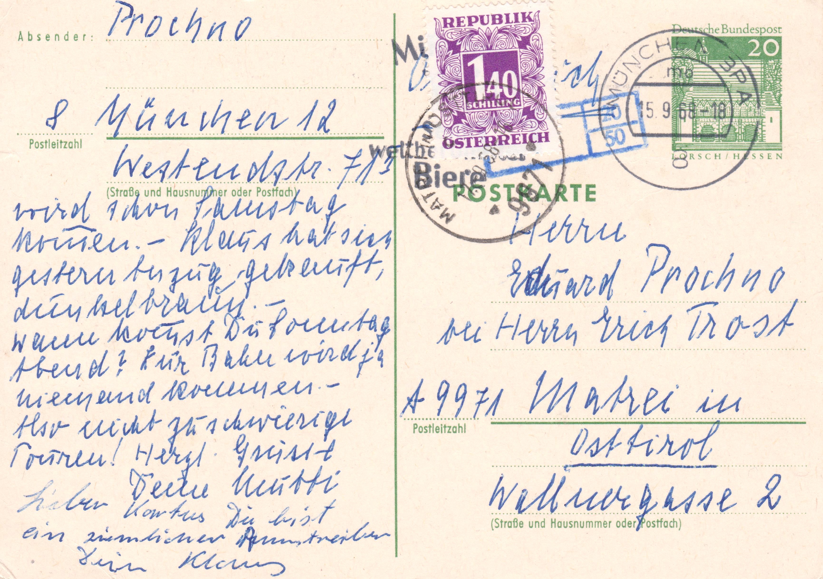 Ganzsache mit eingedrucktem Postwertzeichen zu 20 Pfennig, adressiert nach "A 9971 Matrai in Osttirol, aufgegeben am 11.09.1968 in München: