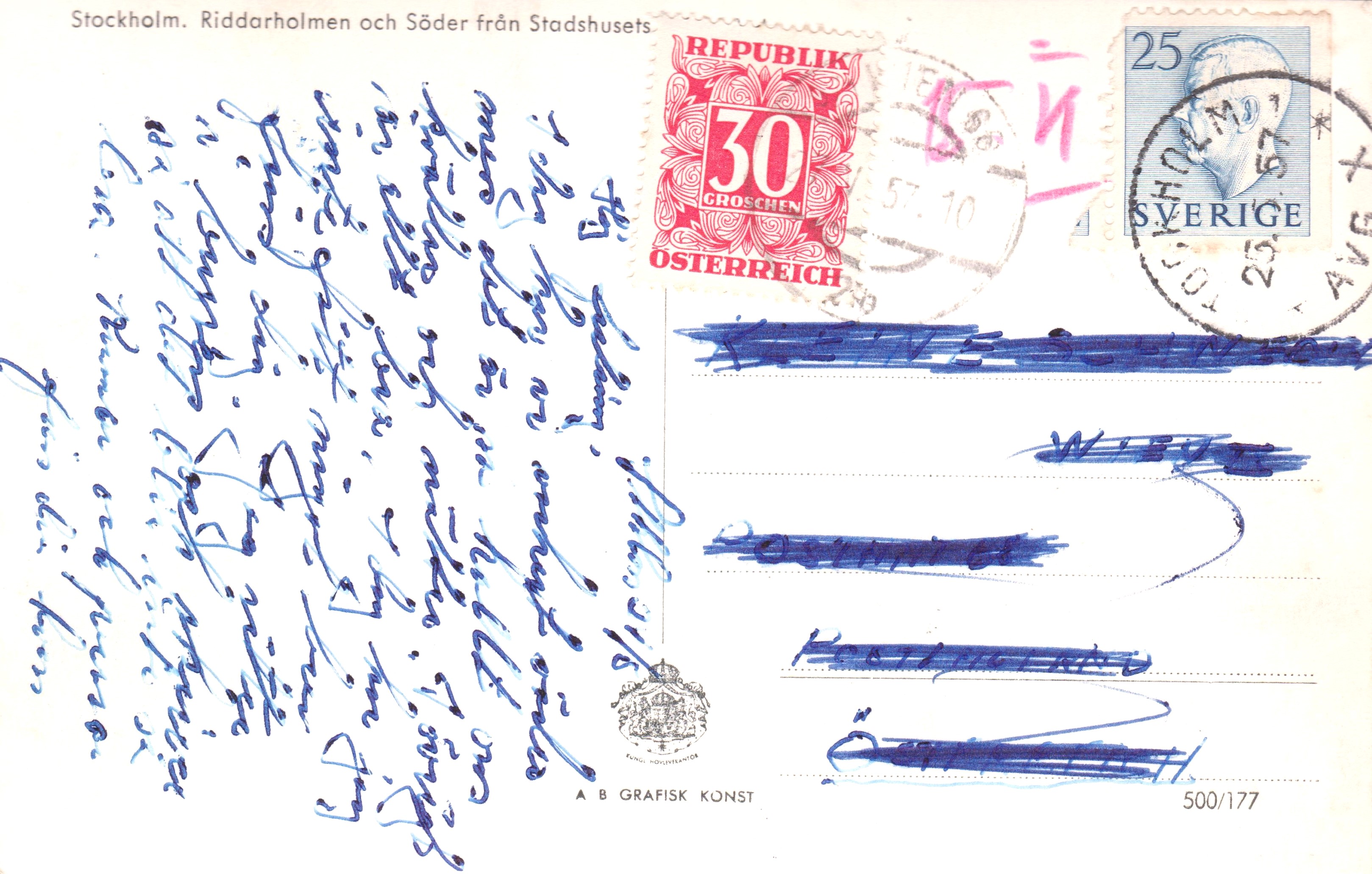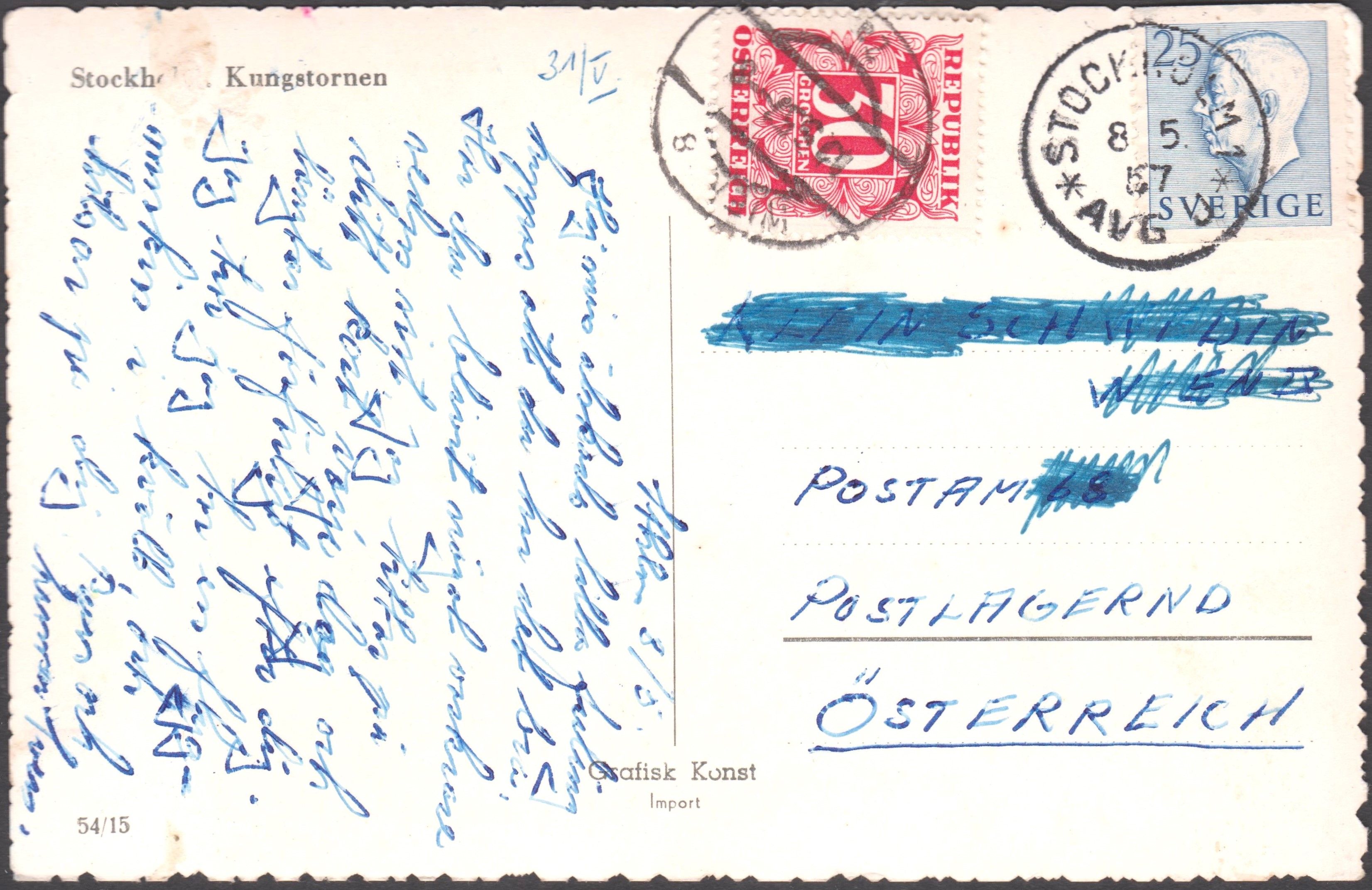 Diese Ansichtskarten wurden aus Schweden mit 25 portogerecht frankiert und adressiert "WIEN 68 POSTLAGERND":