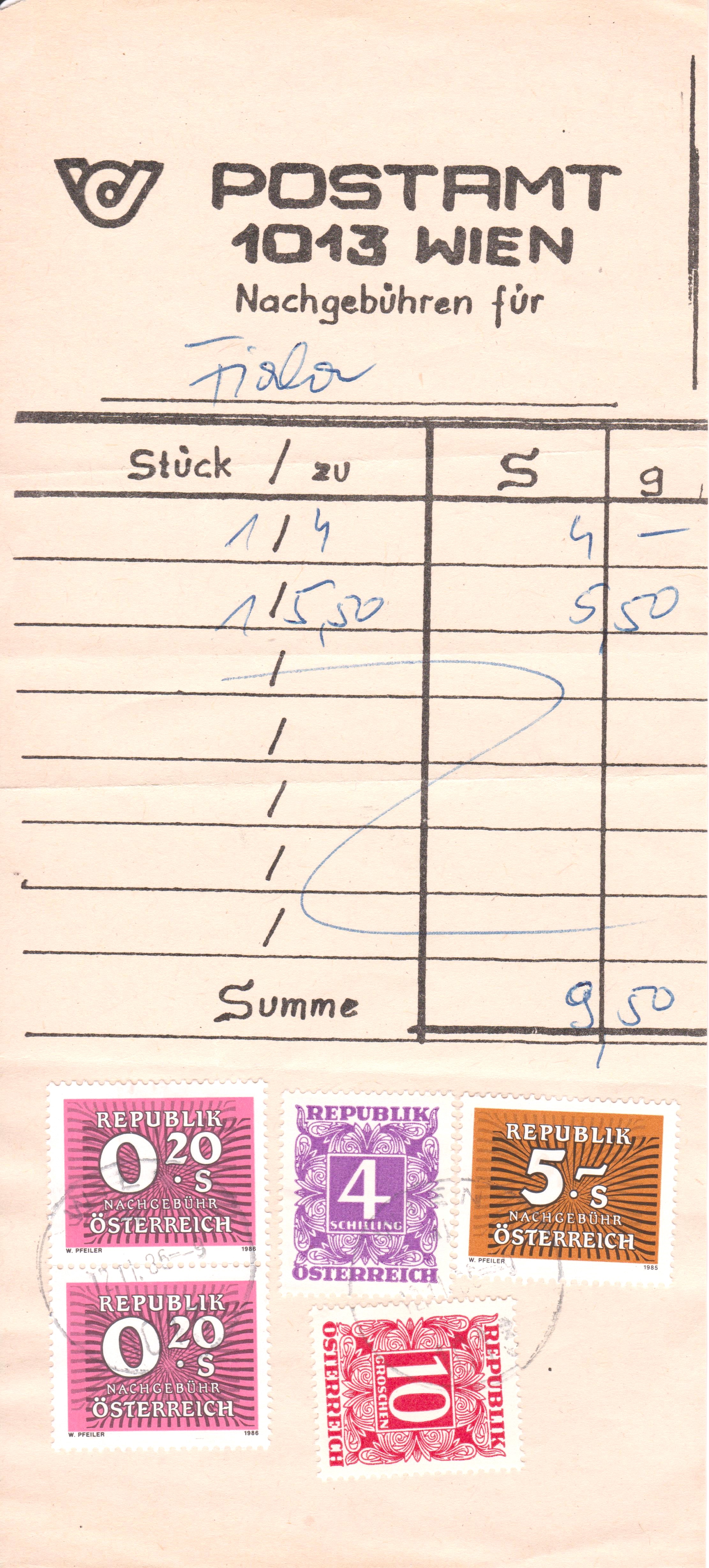 Auf diesem Vordruck "POSTAMT 1013 WIEN Nachgebühren" wurden 9,50 Schilling als Nachgebühr verklebt: