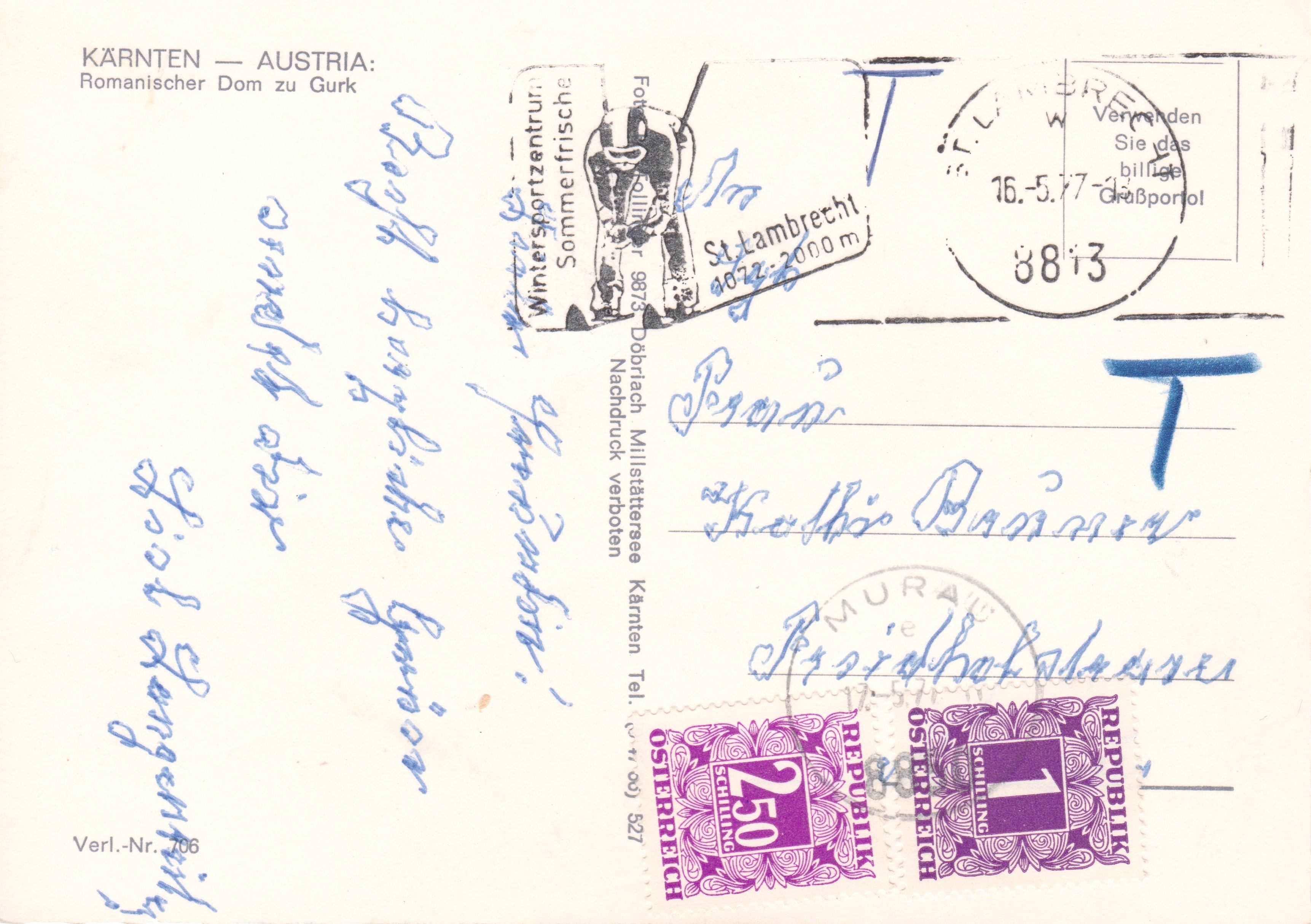 Diese am 16.05.1977 unfrankiert aufgegebene Postkarte wurde mit 3,50 Schilling an Nachgebühr belegt: