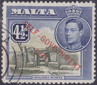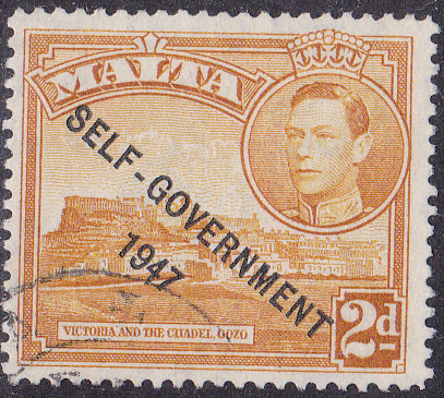 Aus dieser Serie zeige ich die Marke zu 3 Pence in blau mit dem Aufdruck "SELF-GOVERNMENT / 1947" (MiNr 205).