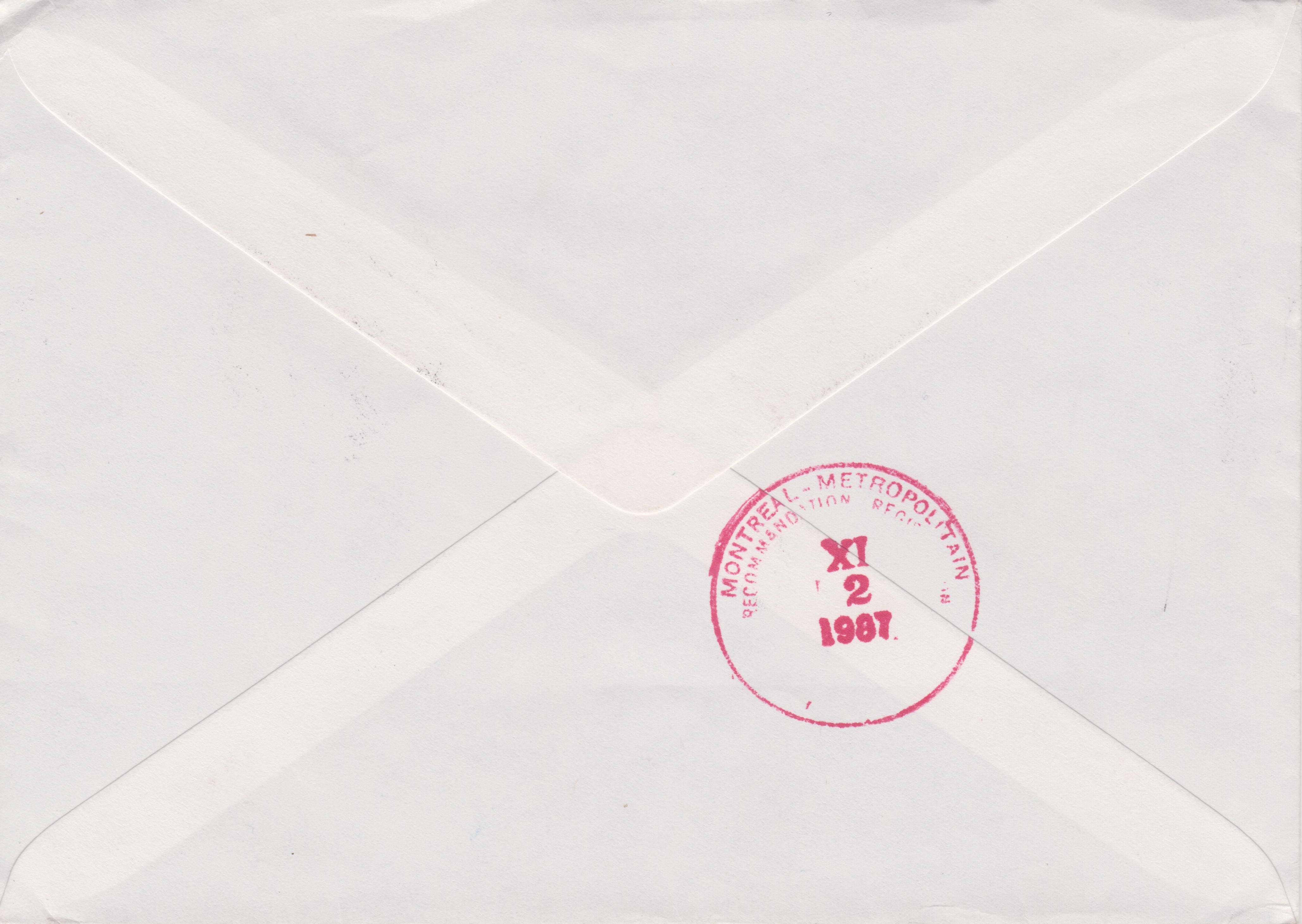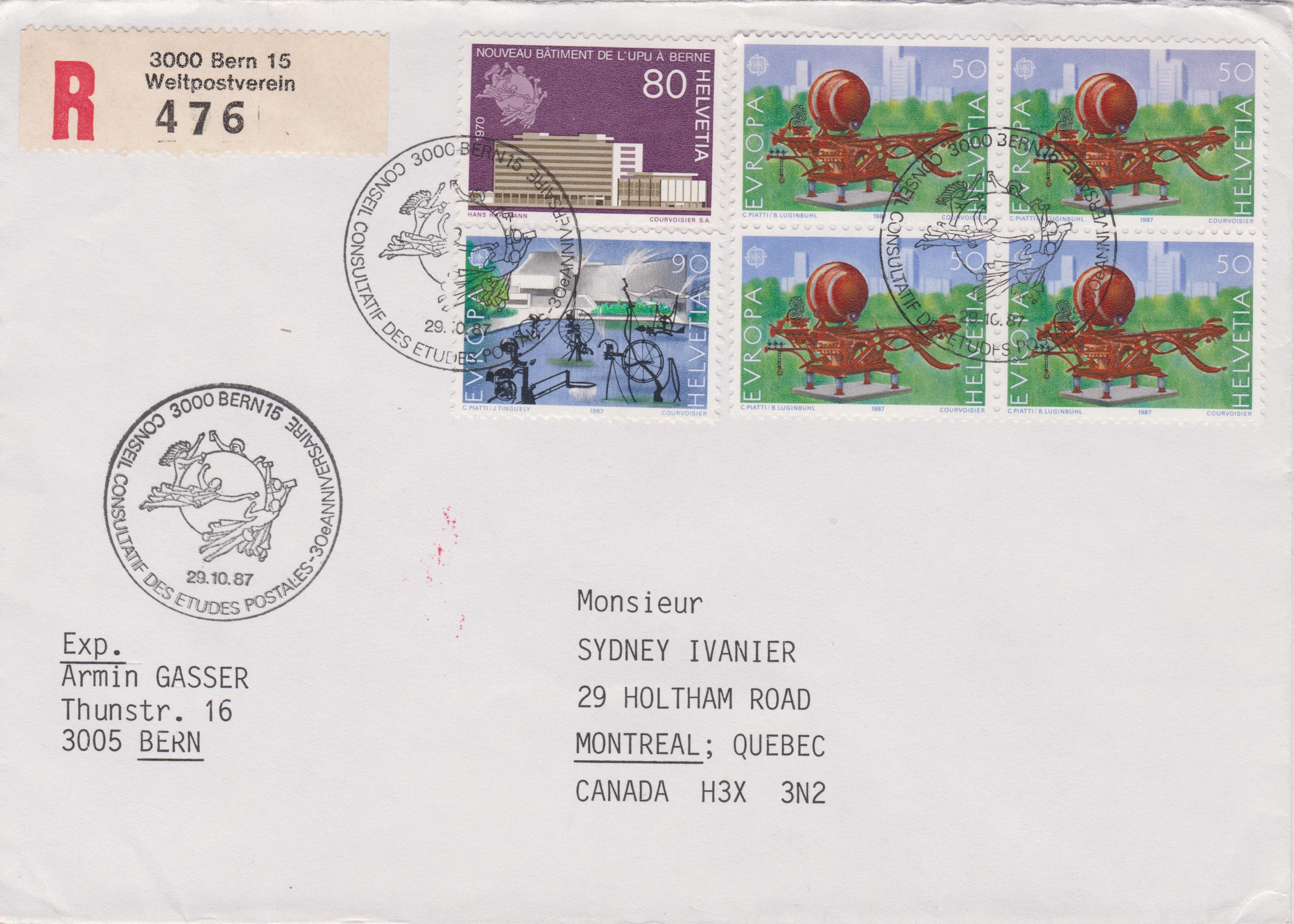 Dieser Brief nach CANADA wurde per Einschreiben am 29.10.1987 in 3000 BERN 15 aufgegeben: