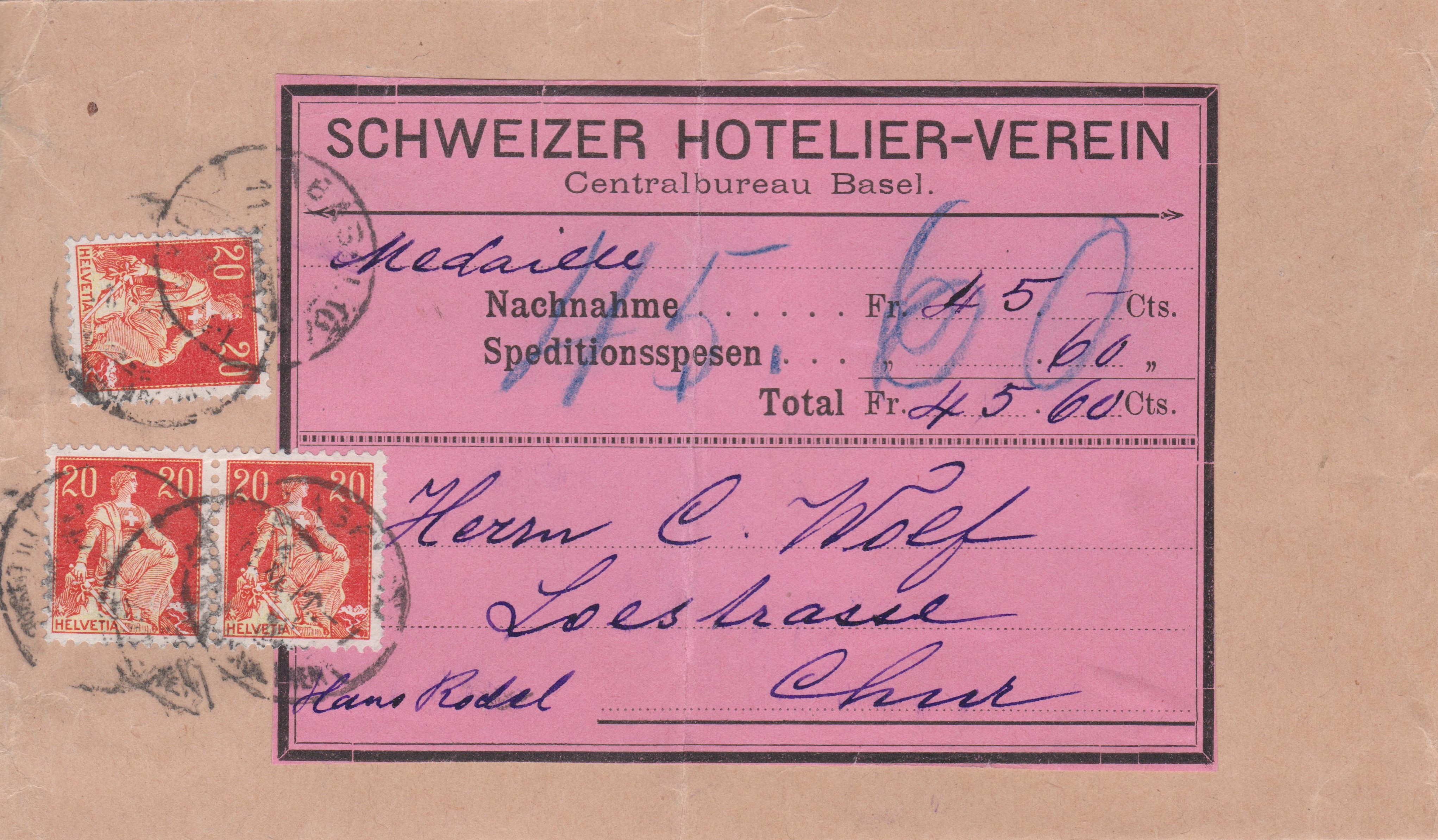 Dazu kamen "Speditionsspesen" in Höhe von 60 Rappen, die als Porto in Form von Freimarken auf diesem Beleg verklebt wurden.