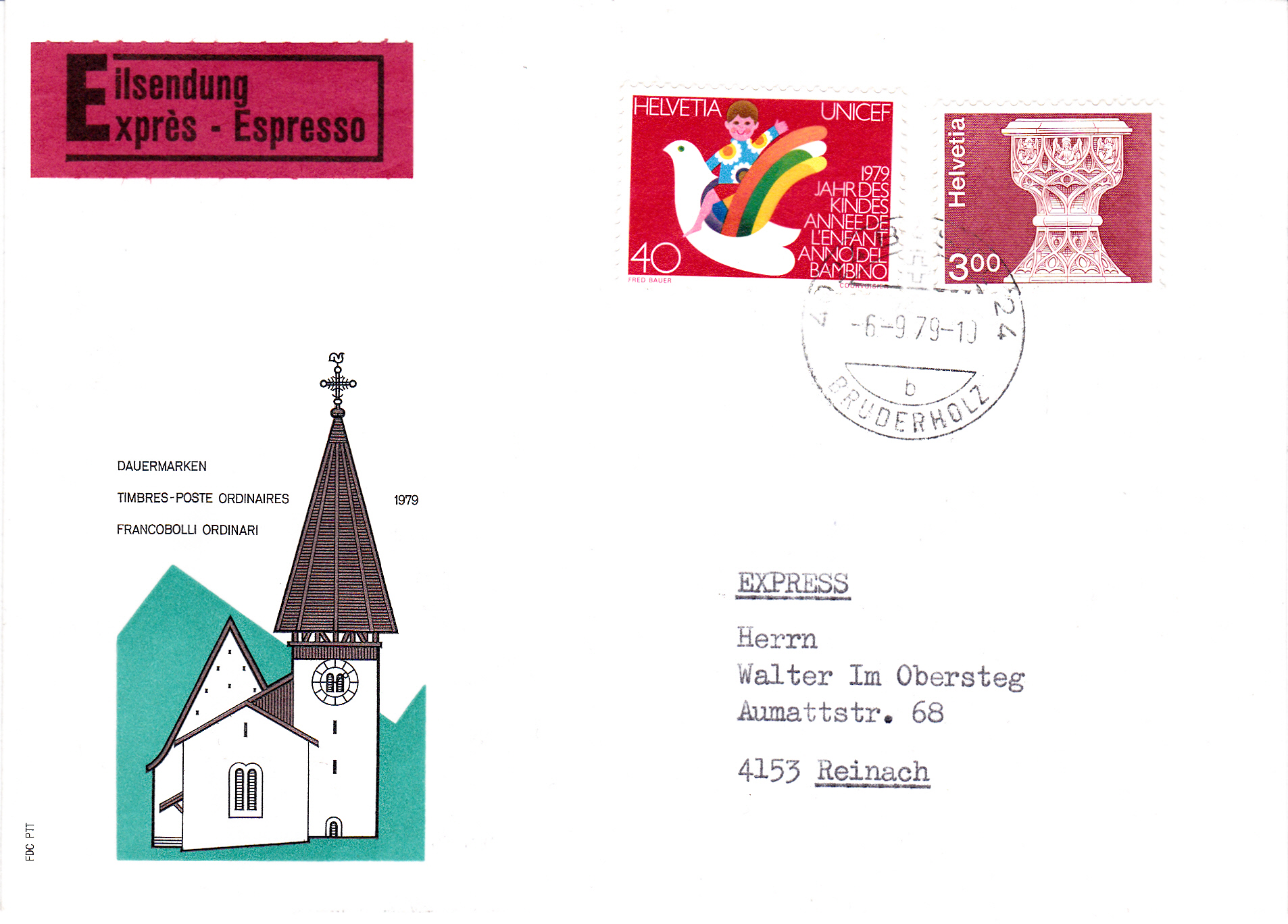 Auf diesem Brief als Eilsendung wurde die Marke zu 3,00 Franken wurde am Ersttag zusammen mit einer Marke zu 40 Rappen als Frankatur verwendet. Das Port berechnet sich wie folgt: Briefporto 40 Rappen, Zusatzleistung Eilsendung 3,00 Franken, zusammen also 3,40 Franken.