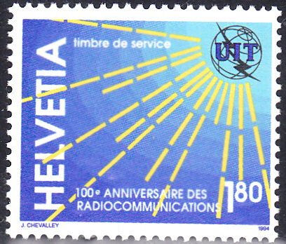 Für die Internationale Fernmeldeunion UIT sind in der Schweiz eigene Dienstmarken erschienen. Am 15.5.1994 erschien diese Marke (MiNr 15) zum Thema "100 Jahre Radio".