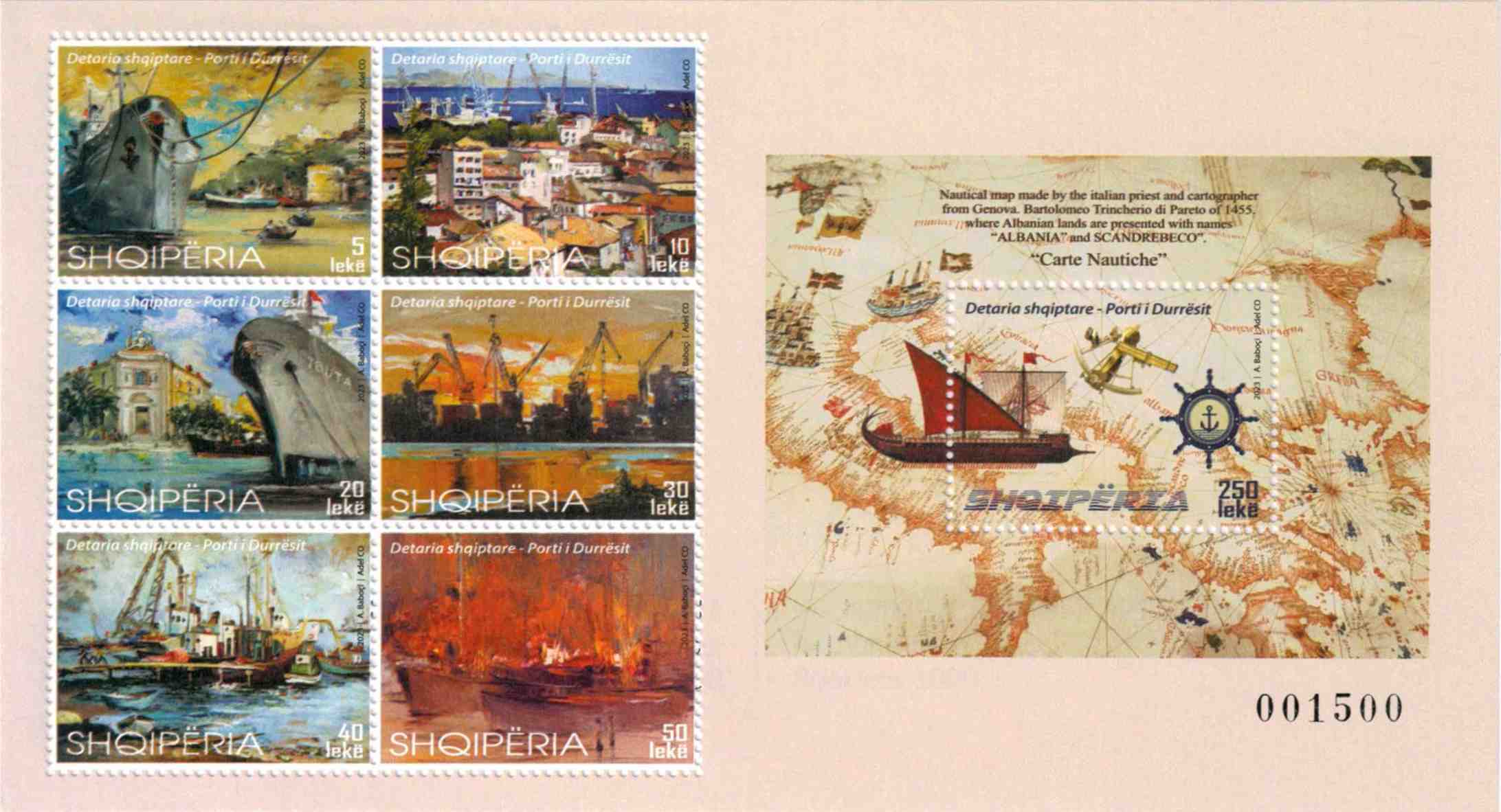 Albanien 2023 - MiNr.  Hafen Durres, Portolankarte 1455 Bartolomeo Trincherio di Pareto.jpg