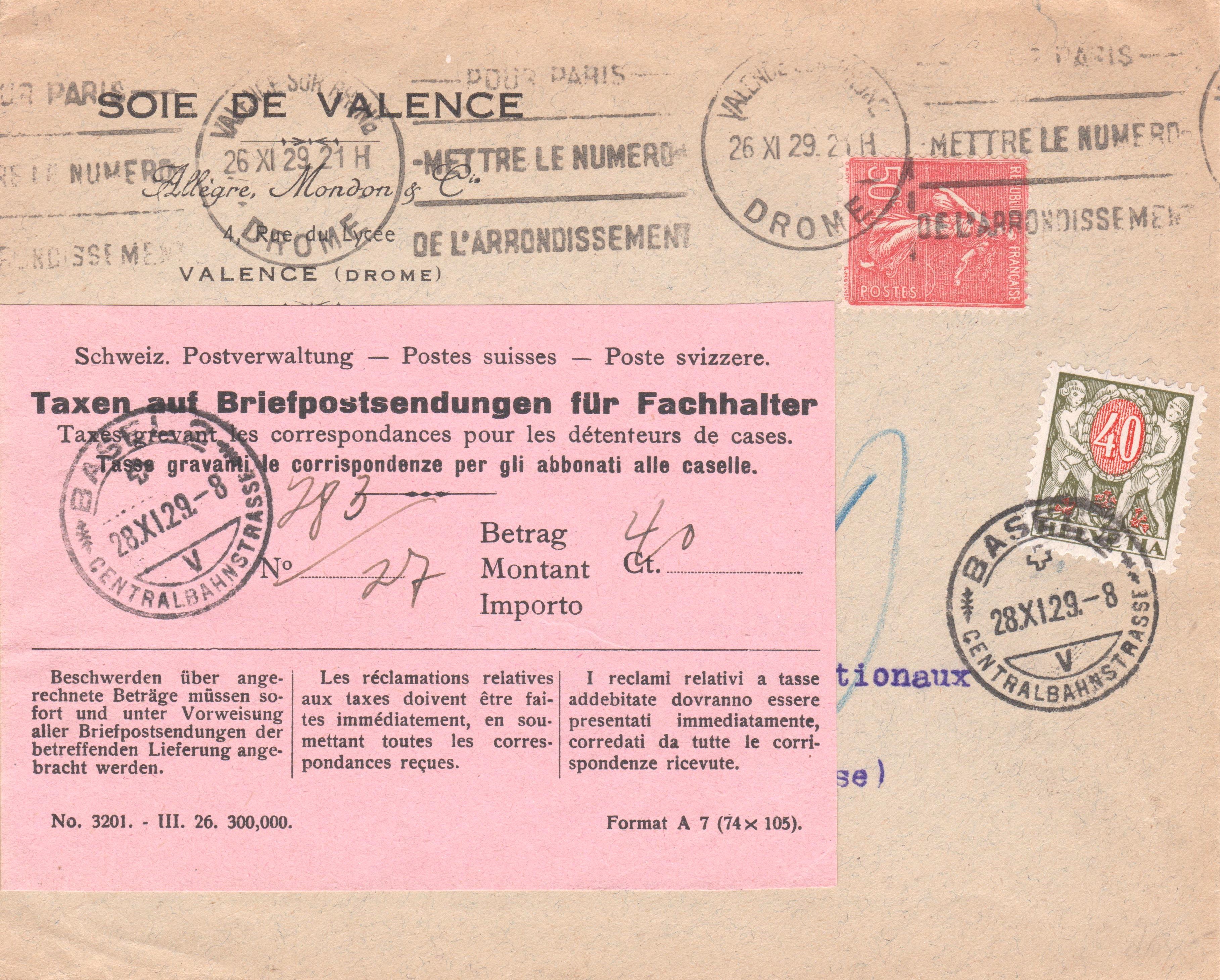 Dieser Brief aus Frankreich wurde am 28.11.1929 in BASEL mit 40 Rappen belegt, die der Empfänger, ein "Fachhalter", also der Inhaber eines Postfaches, bar am Postschalter bezahlen mußte, um diesen Brief ausgehändigt zu bekommen: