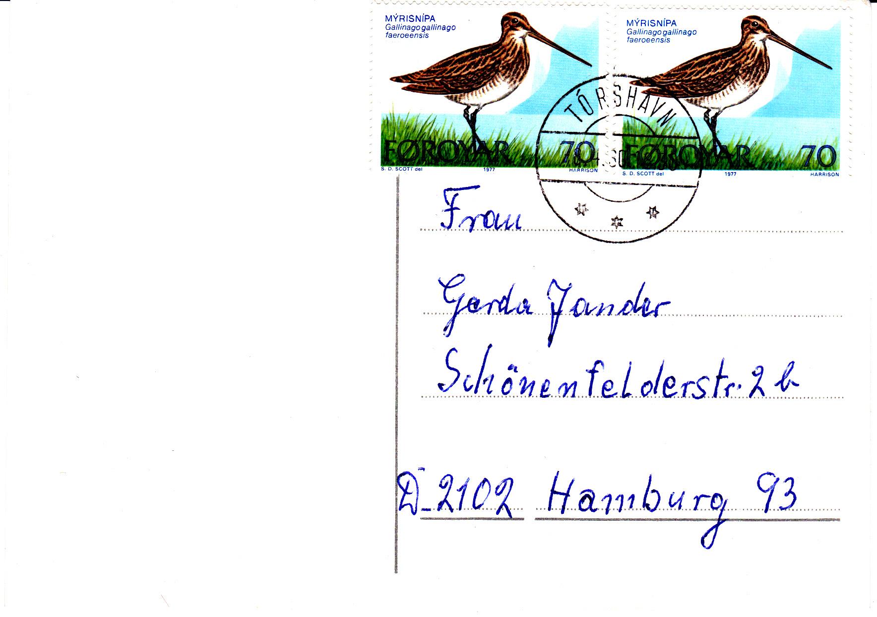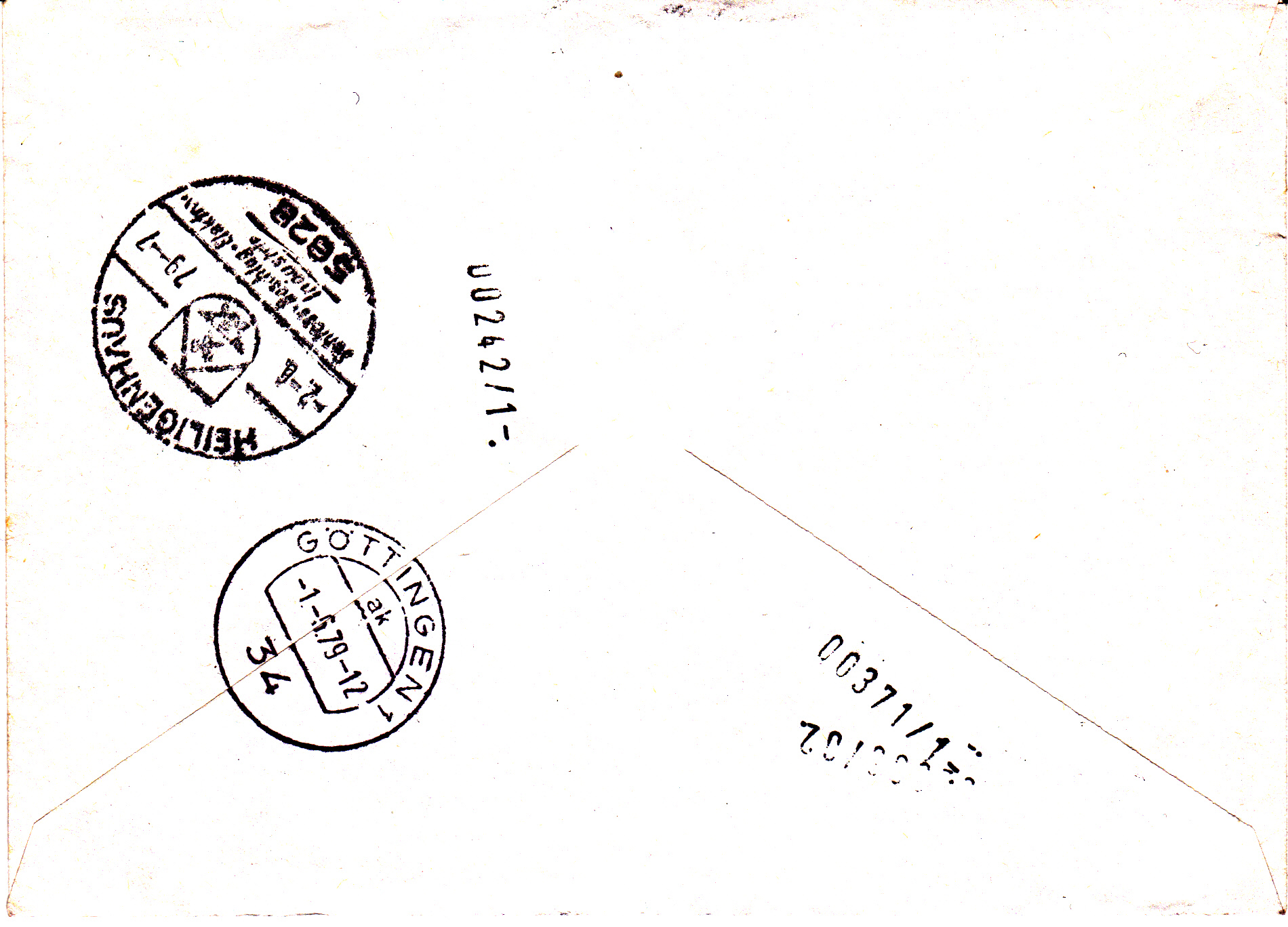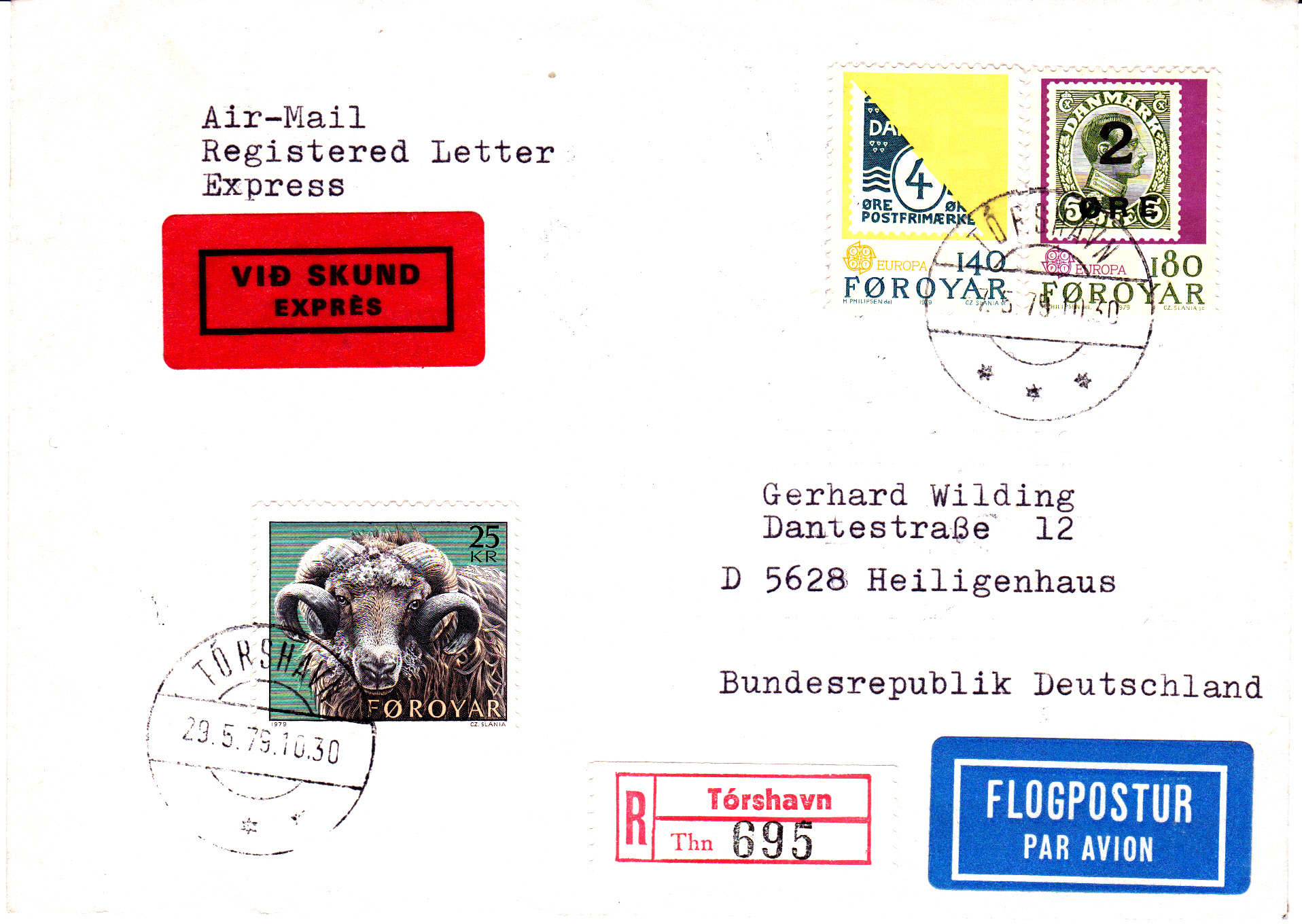 Luftpost-Eilboten-Einschreibebrief von Torshavn vom 29.5.1779 nach D-5628 Heiligenhaus, frankiert mit MiNr 42 (Freimarke Schafzucht) und MiNr 43/44 (Europamarken 1979). Rückseitig wurden Durchgangsstempel und Ankunftsstempel Göttingen (1.6.79 12 Uhr) und Heiligenhaus (2..6. 7 Uhr) abgeschlagen.