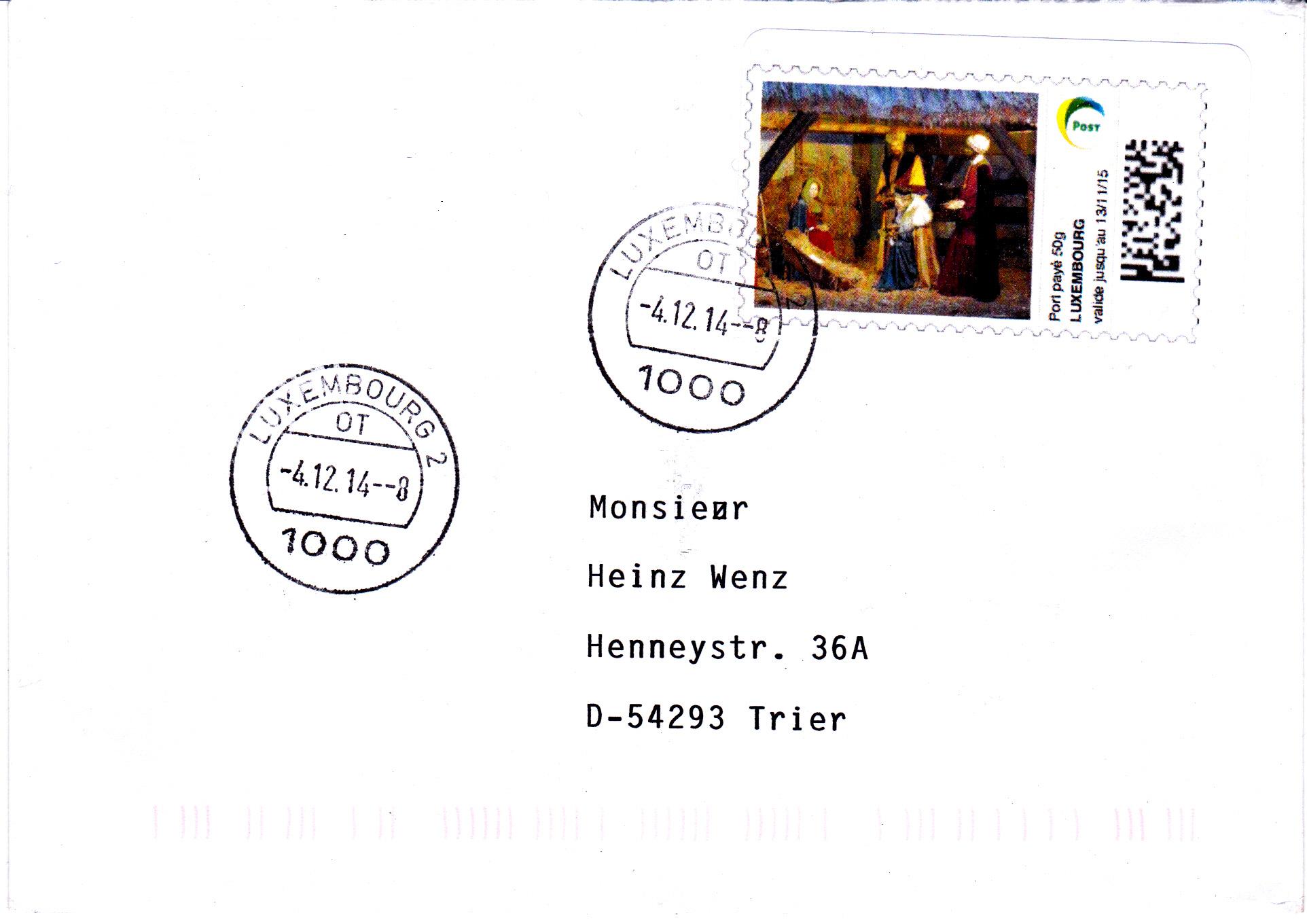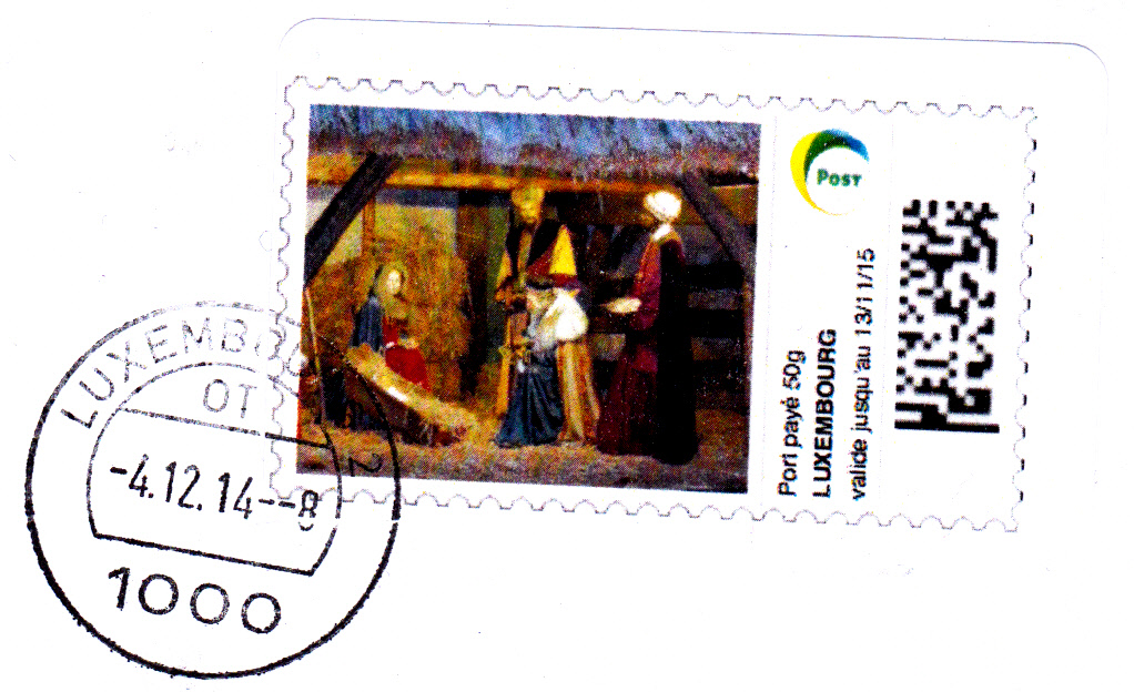 In Luxemburg gibt es offenbar auch Marken individuell. Hier ein Brief mit einer Marke mit Weihnachtsmotiv in der Portostufe bis zu 50 gr mit Gültigkeitsvermerk bis 13.11.2015.