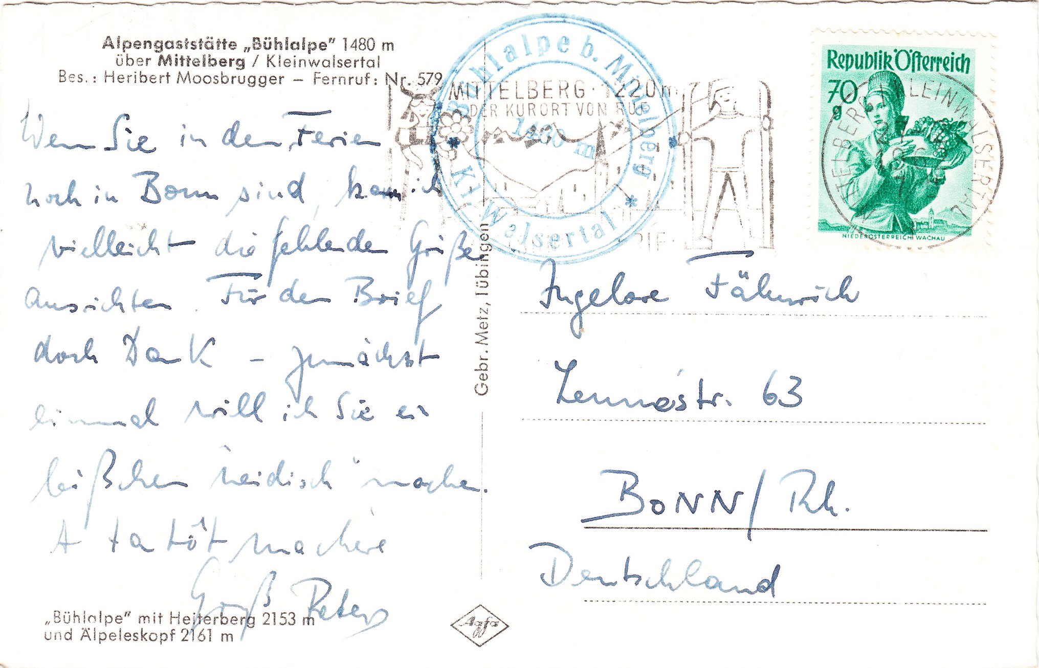 Hier eine Ansichtskarte aus Mittelberg aus dem Jahr 1962, adressiert nach Bonn, die dementsprechend mit 10 Pfennig Inlandsporto freizumachen war.