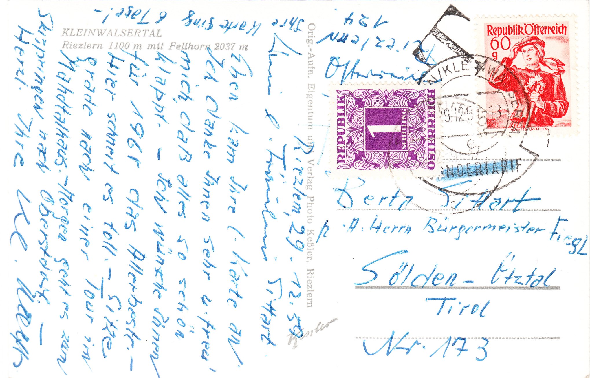 Diese am 29.12.1959 in Riezlern aufgegebene Postkarte war dem Sondertarif nach Deutschland entsprechend korrekt mit 60 Groschen freigemacht, wurde allerdings nicht nach Deutschland, sondern nach Tirol in Österreich adressiert: