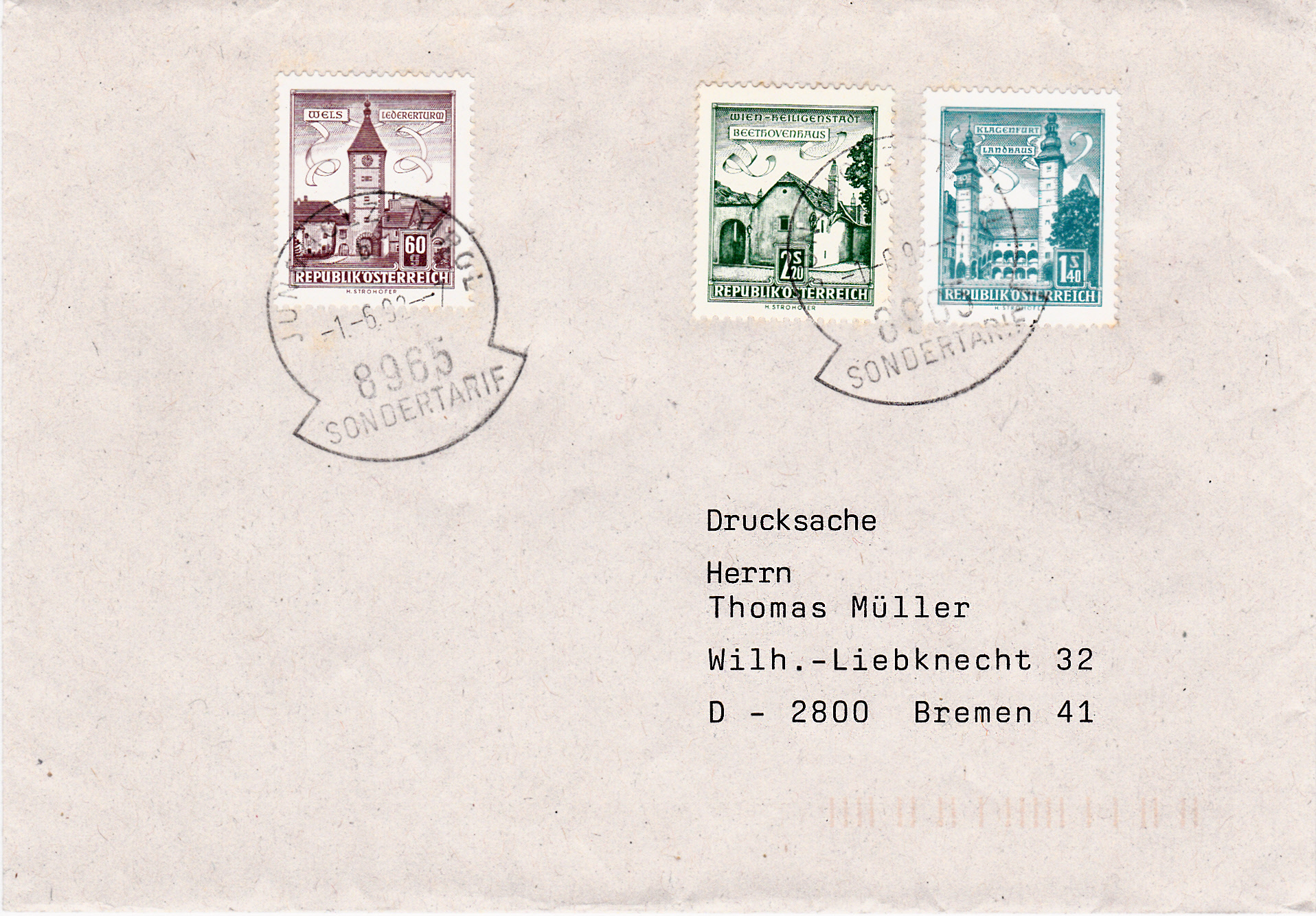 Hier eine Drucksache von Jungholz nach Bremen vom 1.6.1992. Das Porto für eine Inlandsdrucksache betrug bei der Deutschen Bundespost zu dieser Zeit 60Pf, umgerechnet also 4,20 Schilling, die hier auf diesem Umschlag mit Österreichmarken verklebt und mit dem Stempel "Jungholz, Tirol Sondertarif" gestempelt wurden. Der Tarif galt übrigens bis zum 31.10.2005.