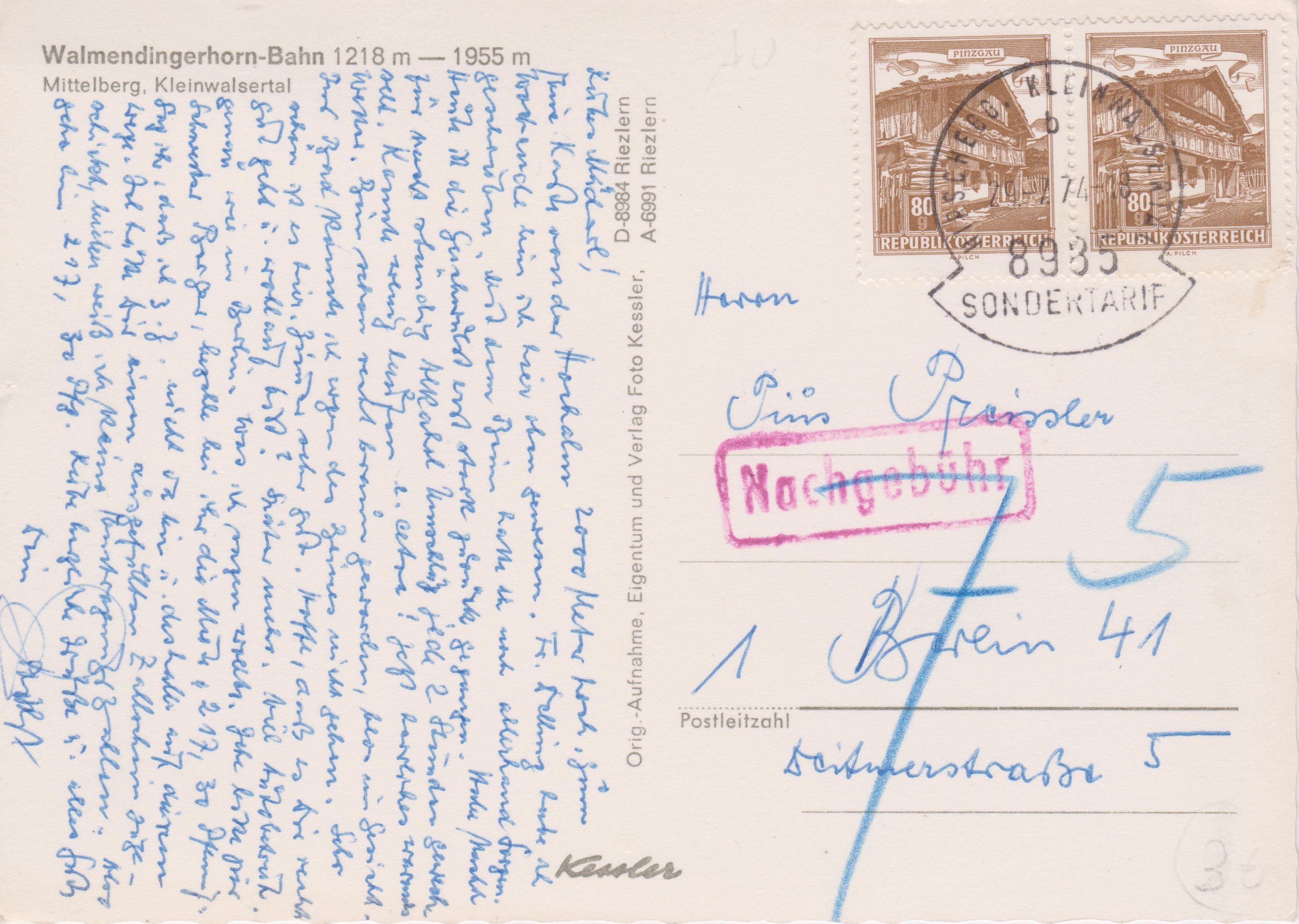 Daher wurde der Zusatz "SONDERTARIF" im Stempel gestrichen und eine Nachgebühr in Höhe von 1 Schilling erhoben, die der Empfänger zu zahlen hatte.